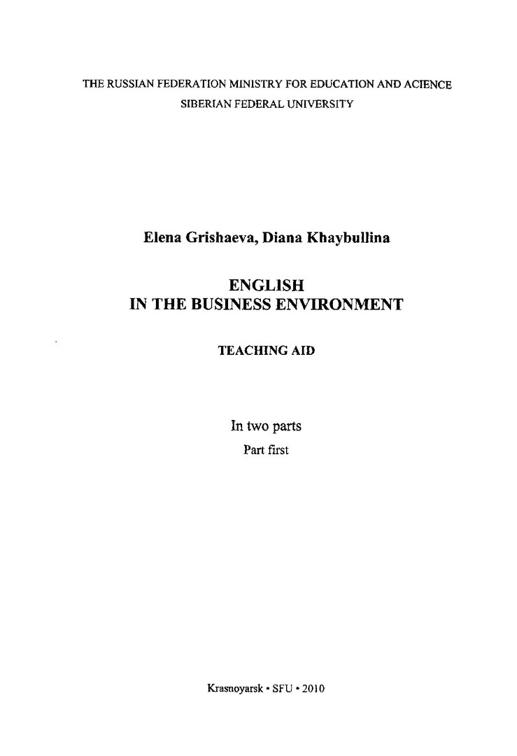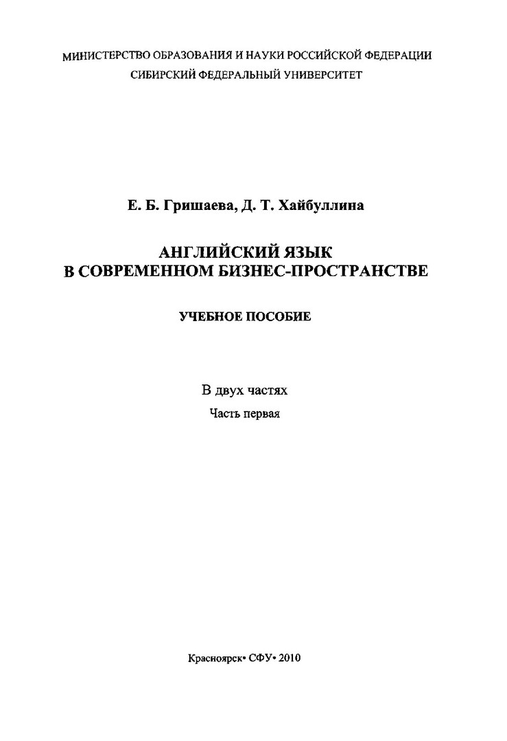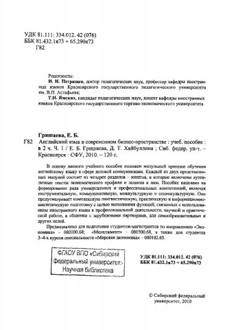 Библиографическое описание:Гришаева, Елена Борисовна. Английский язык в современном бизнес-пространстве = English in the Business Environment : в 2 частях : учебное пособие / Е. Б. Гришаева, Д. Т. Хайбуллина ; Сибирский федеральный университет [СФУ]. - Красноярск : Сибирский федеральный университет [СФУ], 2010 - . - Текст : непосредственный. + Текст : электронный. Часть 1. - 2010. - 119 с. - Bibliography: с.119. - : 43 р.