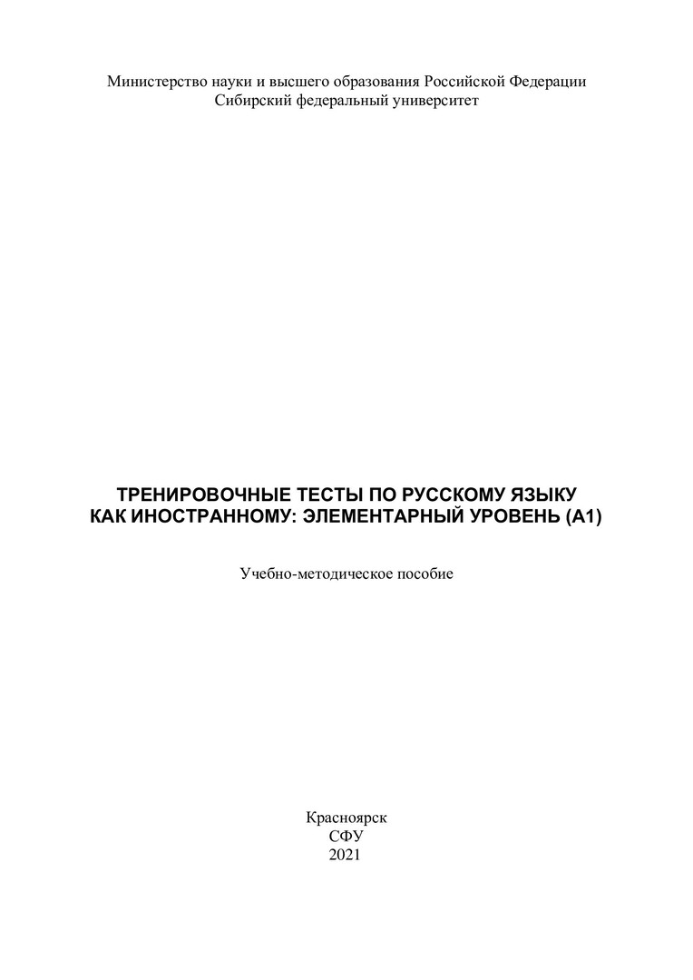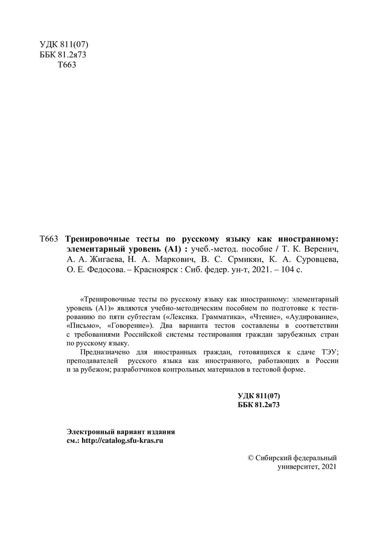 Библиографическое описание: Тренировочные тесты по русскому языку как иностранному: элементарный уровень (А1) : учебно-методическое пособие / Т. К. Веренич, А. А. Жигаева, Н. А. Маркович [и др.]. ; Сиб. федер. ун-т, Ин-т филологии и яз. коммуникации. - Электрон. текстовые дан. (pdf, 1,5 Мб). - Красноярск : СФУ, 2021 (2021-03-24). - 104 с. - Загл. с титул. экрана. - Электрон. версия печ. публикации . - 100 экз. - Изд. № 2021-13286 : Б. ц. - Текст : непосредственный : электронный.