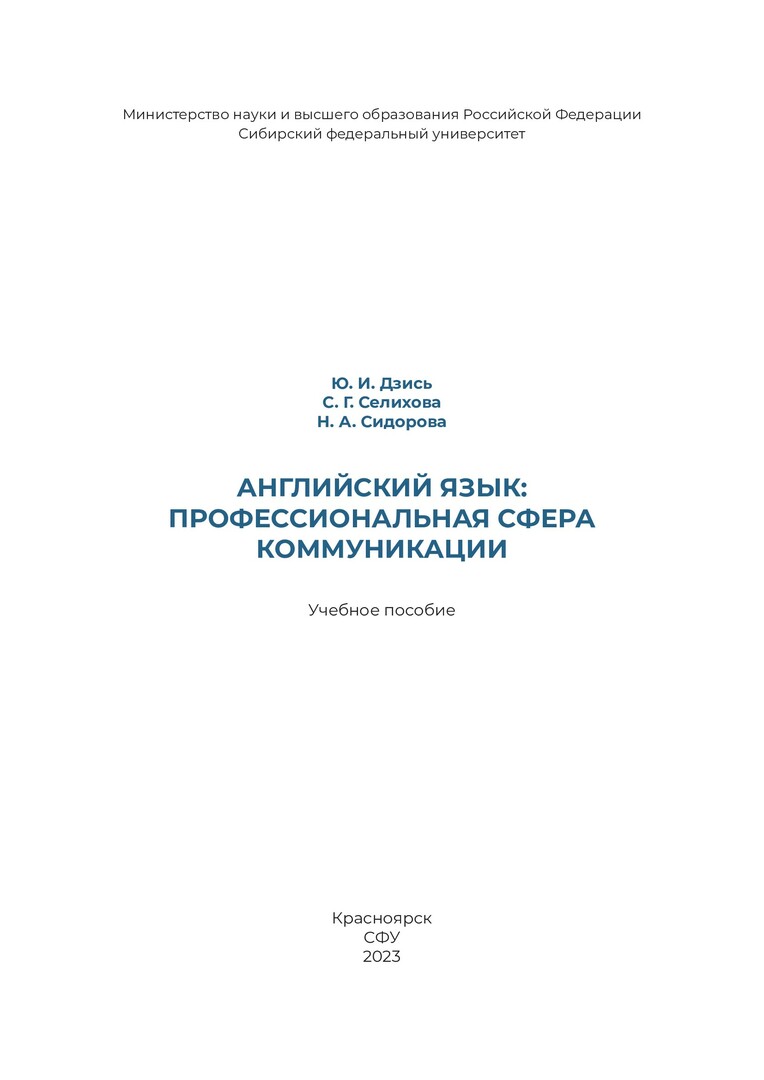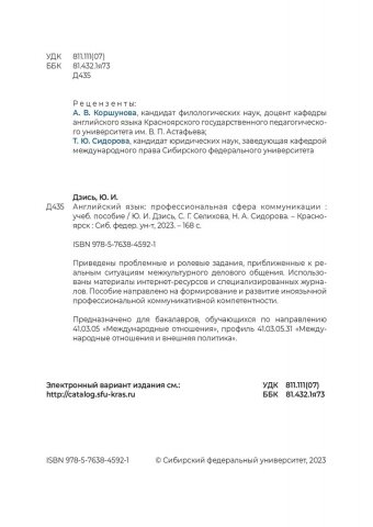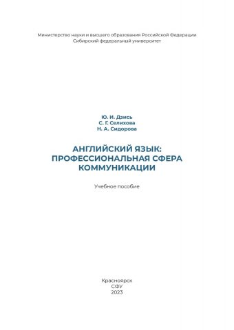 Библиографическое описание: Дзись, Юлия Ивановна. Английский язык: профессиональная сфера коммуникации : учебное пособие / Ю. И. Дзись, С. Г. Селихова, Н. А. Сидорова ; рец.: А. В. Коршунова, Т. Ю. Сидорова ; Сибирский федеральный университет, Институт филологии и языковой коммуникации. - Электрон. текстовые дан. (1,8 Мб). - Красноярск : СФУ, 2023 (2021-10-05). - 168 с., 10.5 усл. печ. л. : табл. - Загл. с титул. экрана. - Электрон. версия печ. публикации . - Библиогр.: с. 166. - 100 экз. - ISBN 978-5-7638-4592-1 : Б. ц. - Изд. № 2021-14626. - Текст : электронный.