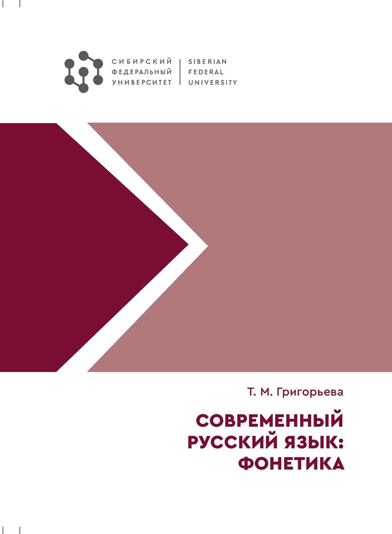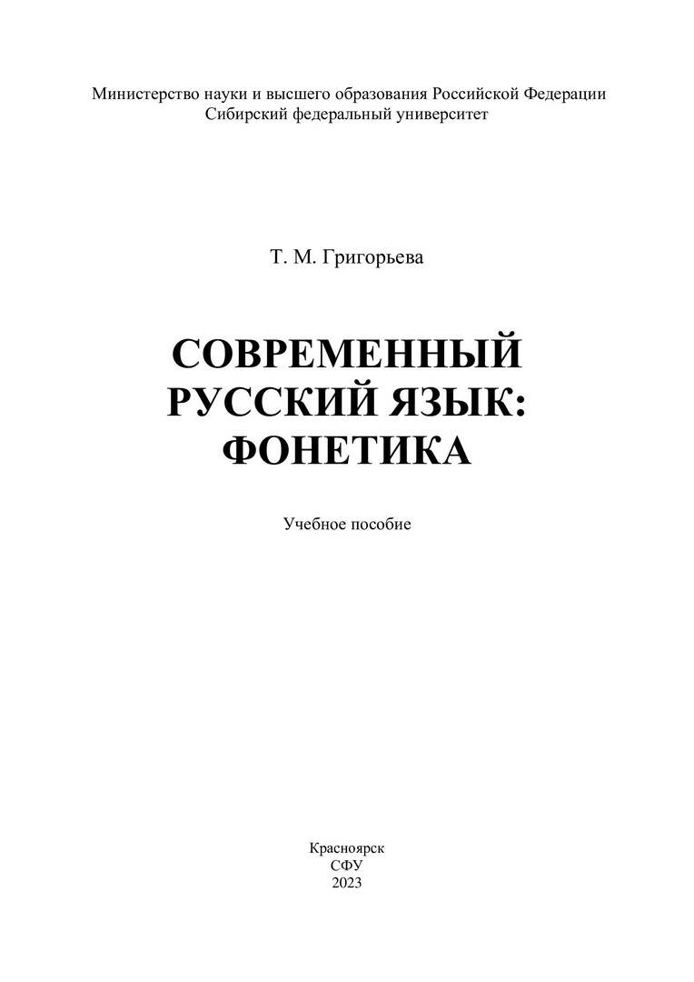 Библиографическое описание: Григорьева, Татьяна Михайловна. Современный русский язык: фонетика : учебное пособие / Т. М. Григорьева ; рец.: Г. И. Панова, С. В. Науменко ; Сибирский федеральный университет, Институт филологии и языковой коммуникации. - Электрон. текстовые дан. (1,9 Мб). - Красноярск : СФУ, 2023 (2023-11-24). - 116 с., 7.3 усл. печ. л. : ил., табл. - Загл. с титул. экрана. - Электрон. версия печ. публикации . - Библиогр.: с. 112-113. - 100 экз. - ISBN 978-5-7638-4721-5 : Б. ц. - Изд. № 2022-16734. - Текст : электронный.