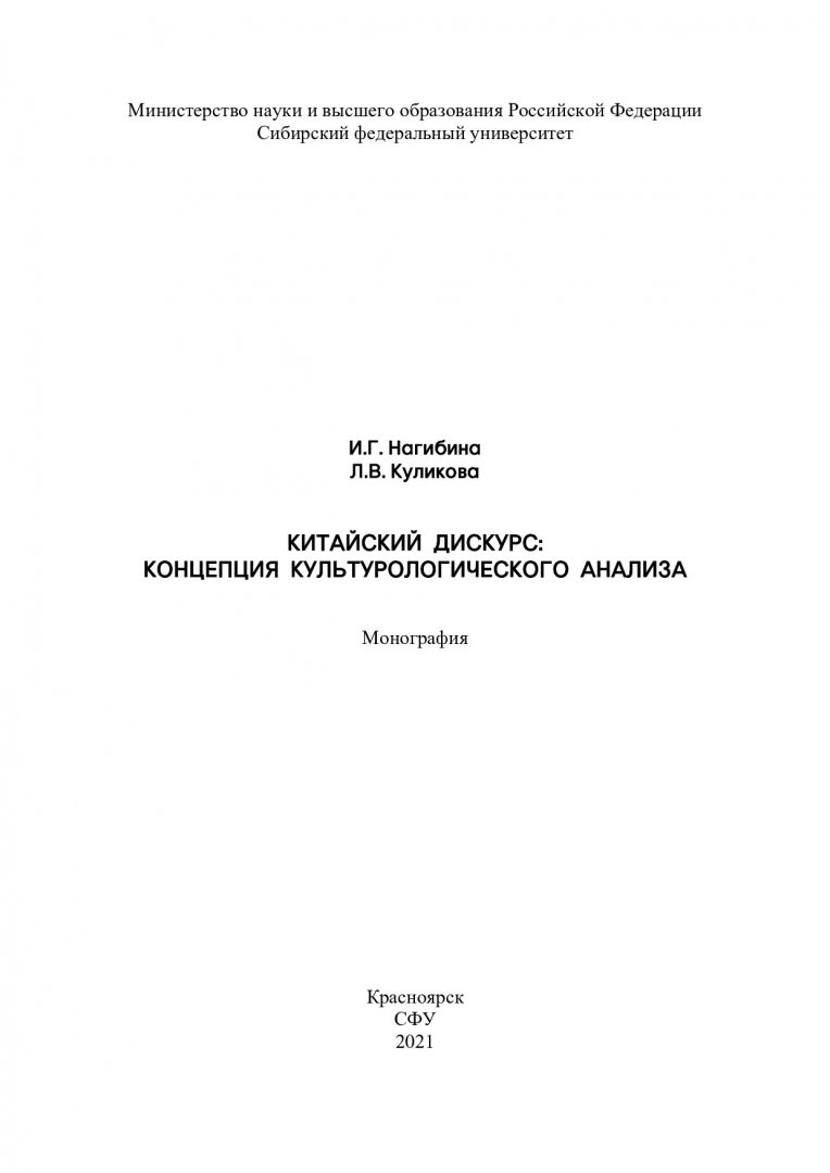Библиографическое описание: Нагибина, Ирина Геннадьевна. Китайский дискурс: концепция культурологического анализа : монография / И. Г. Нагибина, Л. В. Куликова ; рец.: О. В. Магировская, Д. А. Савкин ; Сибирский федеральный университет, Институт филологии и языковой коммуникации. - Красноярск : СФУ, 2021 (2021-04-27). - 180 с., 11.2 усл. печ. л. : схемы. - Библиогр.: с. 153-178. - 500 экз. - ISBN 978-5-7638-4419-1 : 345.00 р. - Изд. № 2020-12175. - Текст : непосредственный : электронный.