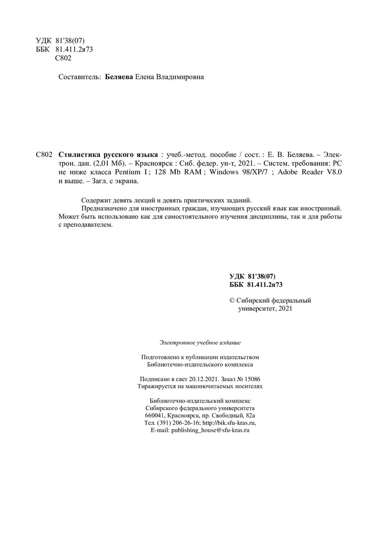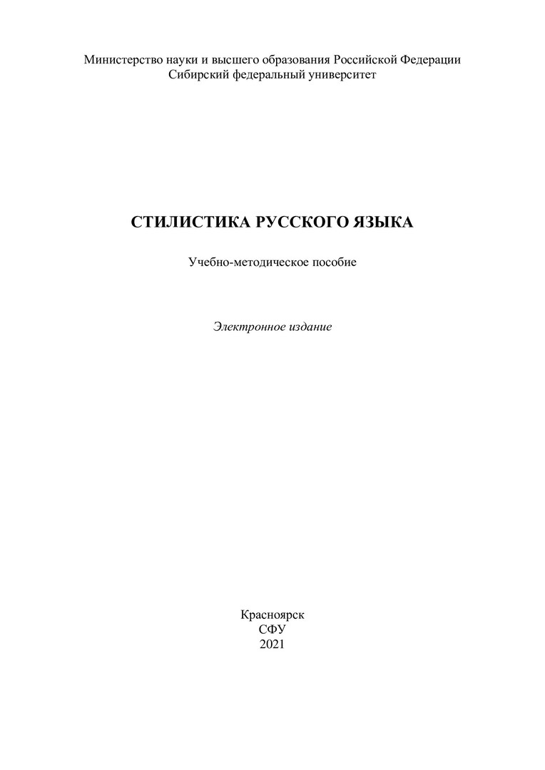 Библиографическое описание: Стилистика русского языка : учебно-методическое пособие / Сиб. федер. ун-т, Ин-т филологии и яз. коммуникации ; сост. Е. В. Беляева. - Электрон. текстовые дан. (pdf, 2 Мб). - Красноярск : СФУ, 2021 (2021-11-29). - 103 с. - Загл. с титул. экрана. - Изд. № 2021-15086 : Б. ц. - Текст : электронный.