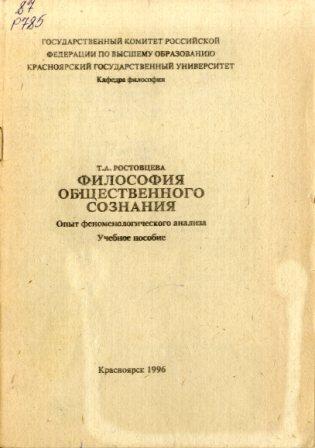 Библиографическое описание:Ростовцева, Тамара Александровна. Философия общественного сознания: опыт феноменологического анализа : учебное пособие / Т. А. Ростовцева ; Красноярский государственный университет, Кафедра истории. - Красноярск : КрасГУ, 1996. - 78 с. - ISBN 5-7638-0037-0 : 2800.00 р. - Текст : непосредственный.