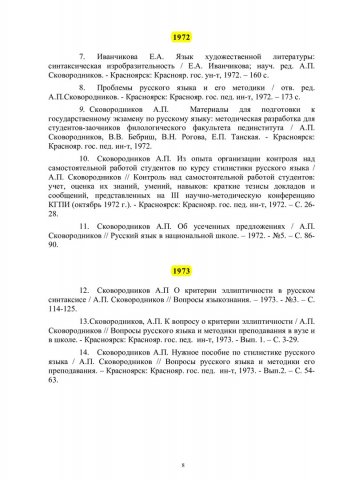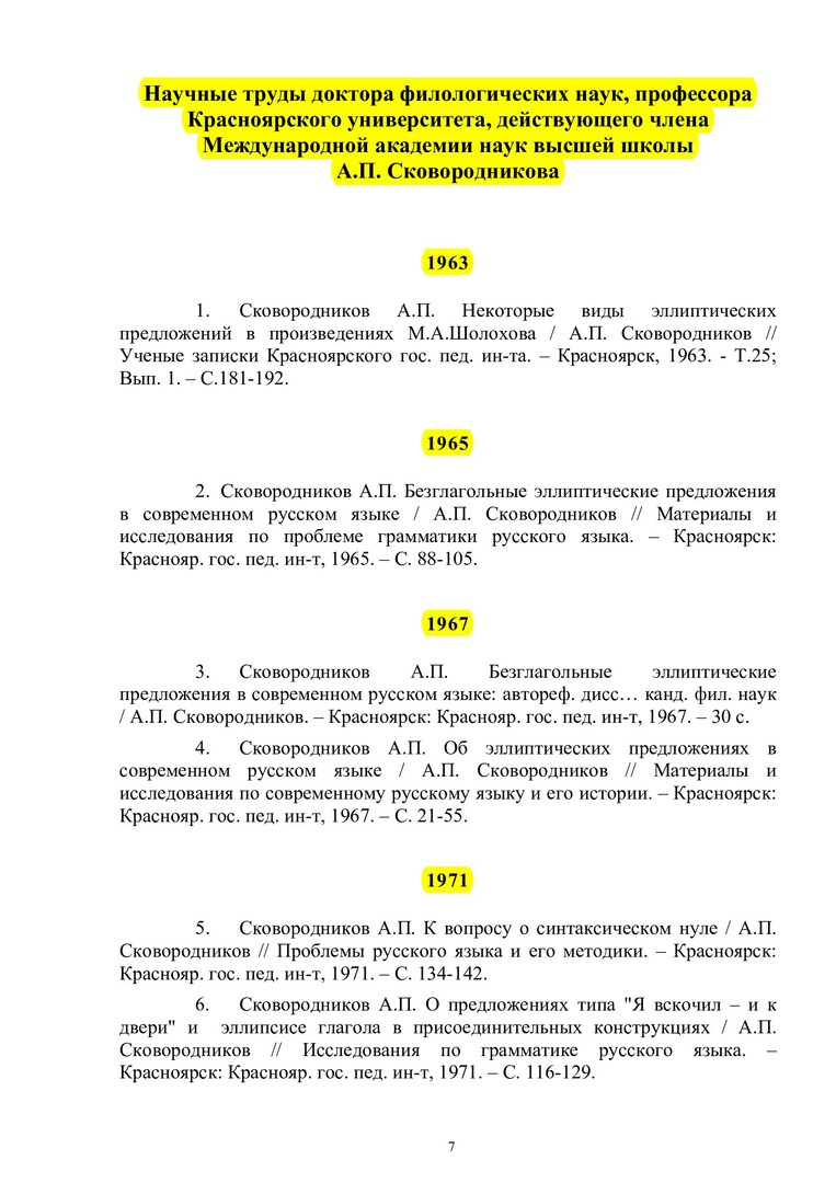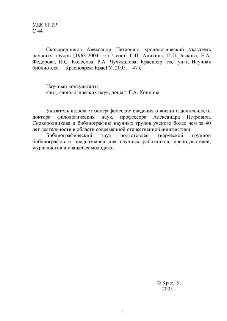 Библиографическое описание:Сковородников Александр Петрович : хронологический указатель научных трудов, 1963-2004 гг. / Красноярский государственный университет, Научная библиотека ; сост. С. П. Аникина [и др.]. - Красноярск : КрасГУ, 2005. - 44 с. - (Биобиблиография ученых). - 20.00 р., 5.00 р., 10.00 р. - Текст : непосредственный + Текст : электронный.
