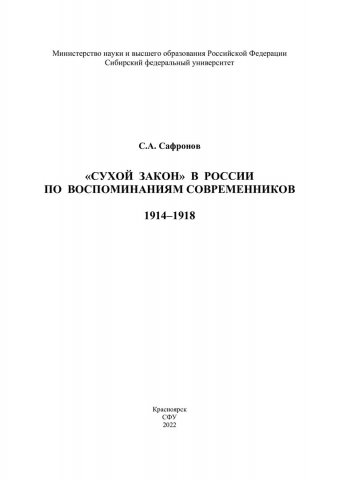 Библиографическое описание: Сафронов, Сергей Алексеевич. "Сухой закон" в России в воспоминаниях современников. 1914-1918 гг. / С. А. Сафронов ; рец.: М. Д. Северьянов, А. И. Бакшеев, А. А. Нихочина ; Сибирский федеральный университет, Гуманитарный институт. - Электрон. текстовые дан. (6,4 Мб). - Красноярск : СФУ, 2022 (2022-12-21). - 548 с., 34.3 усл. печ. л. - Загл. с титул. экрана. - Электрон. версия печ. публикации . - Библиогр.: с. 538-546. - 500 экз. - ISBN 978-5-7638-4587-7 : Б. ц. - Изд. № 2021-14855. - Текст : электронный.
