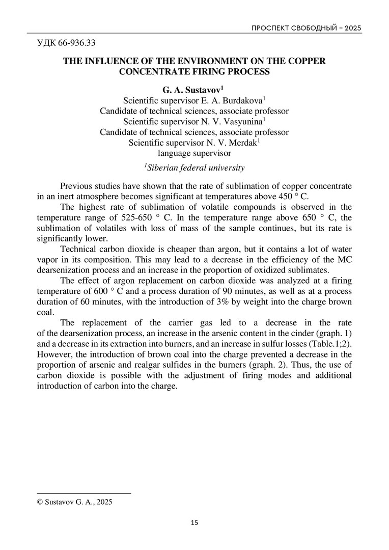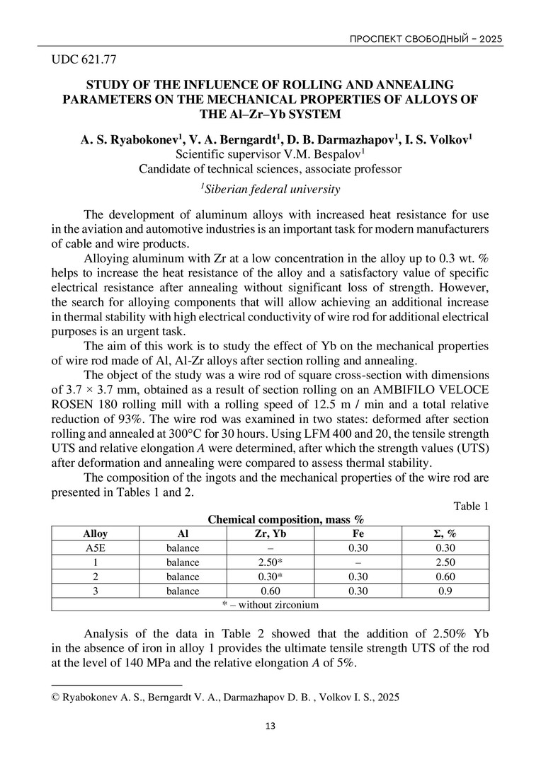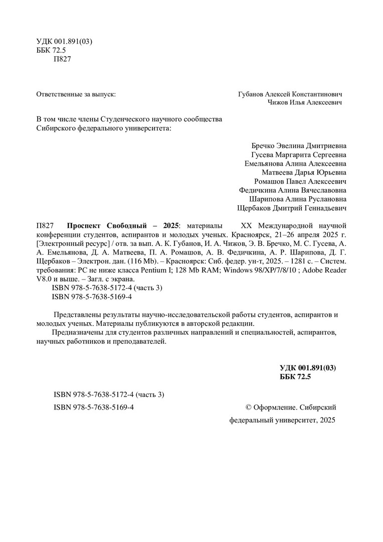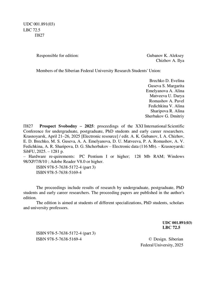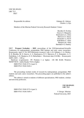 Библиографическое описание:Проспект Свободный - 2025 = Prospect svobodny - 2025 : материалы XXI Международной научной конференции студентов, аспирантов и молодых ученых. Красноярск, 21-26 апреля 2025 г.: в 4 частях / Министерство науки и высшего образования Российской Федерации, Сибирский федеральный университет; отв. за вып.: А. К. Губанов, И. А. Чижов, Э. Д. Бречко [и др.]. - Электрон. текстовые дан. (pdf, 42,7 Мб). - Красноярск : СФУ, 2025 . - Загл. с титул. экрана. - ISBN 978-5-7638-5169-4. - Текст : электронный. Ч. III : Технические науки. - 2025. - 1225 с. - Библиогр. в конце ст. - ISBN 978-5-7638-5172-4 : Б. ц.