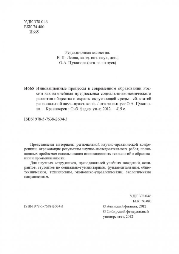 Библиографическое описание: Инновационные процессы в современном образовании России как важнейшая предпосылка социально-экономического развития общества и охраны окружающей среды : сборник статей региональной научно-практической конференции, (г. Ачинск, 26–27 апреля 2012 г.) / Сиб. федер. ун-т, Ачинск. фил. ; отв. за вып. О. А. Цуканова. - Электрон. текстовые дан. (PDF, 8 Мб). - Красноярск : Сибирский федеральный университет [СФУ], 2012. - Загл. с титул. экрана. - Библиогр. в конце ст. - Изд. № 2012-8225 : Б. ц. - Текст : электронный.