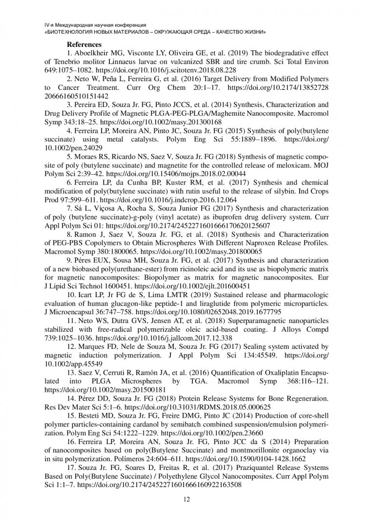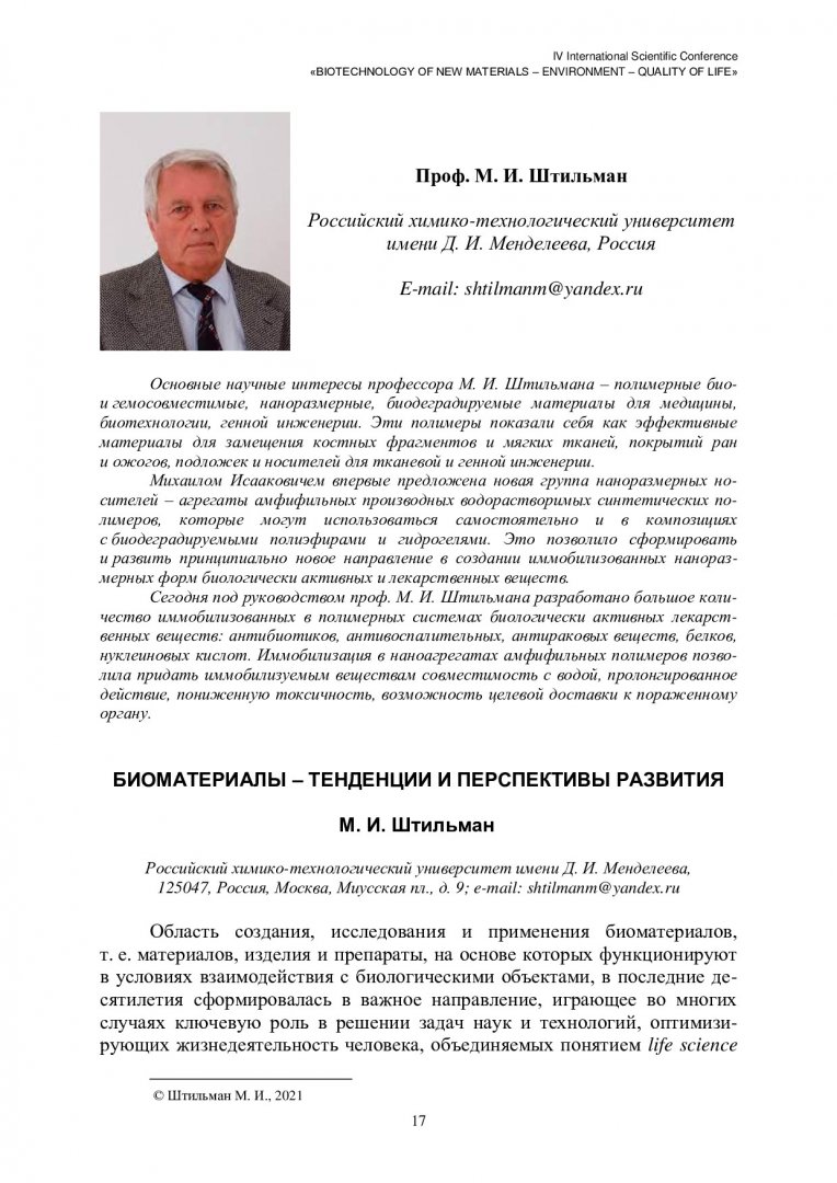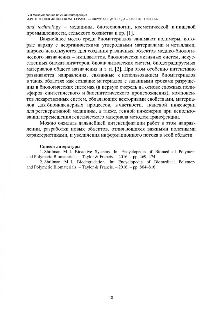 Библиографическое описание: Биотехнология новых материалов - окружающая среда - качество жизни : материалы IV Международной научной конференции. Красноярск, 10–13 октября 2021 г. / Сиб. федер. ун-т, Ин-т фундамент. биологии и биотехнологии ; отв. за вып. А. Г. Суковатый. - Электрон. текстовые дан. (pdf, 7,4 Мб). - Красноярск : СФУ, 2021 (2021-09-14). - 232 с. - Загл. с титул. экрана. - ISBN 978-5-7638-4564-8 : Б. ц. - Изд. № 2021-14580. - Текст : электронный.