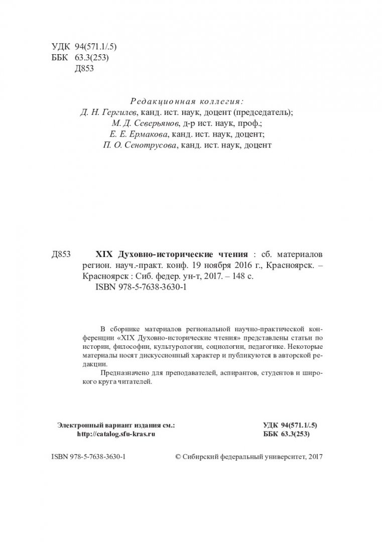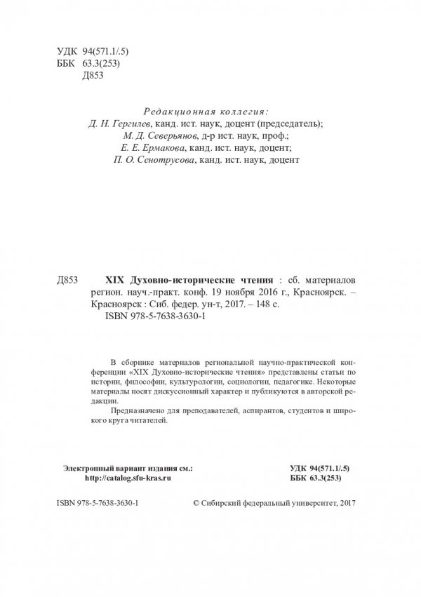 Библиографическое описание: XIX Духовно-исторические чтения : сборник материалов региональной научно-практической конференции 19 ноября 2016 г., Красноярск / Сибирский федеральный университет, Гуманитарный институт ; отв. ред. Д. Н. Гергилев. - Красноярск : СФУ, 2017. - 146 с. - Библиогр. в конце ст. - 35 экз. - ISBN 978-5-7638-3630-1 : 257.00 р. - Изд. № 2017-395. - Текст : непосредственный : электронный.
