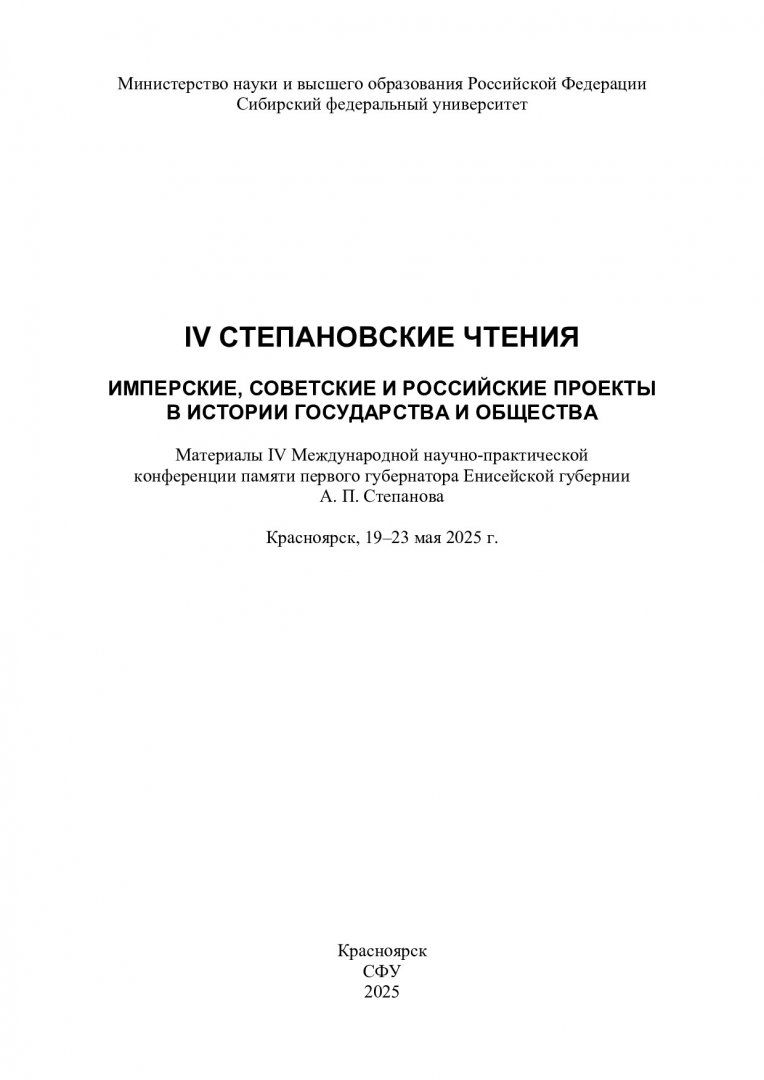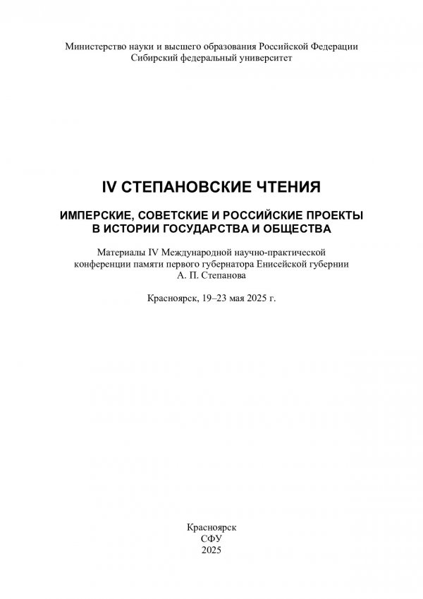 IV Степановские чтения. Имперские, советские и российские проекты в историческом государстве и обществе : материалы IV Международной научно-практической конференции памяти первого губернатора Енисейской губернии А. П. Степанова. Красноярск, 19–23 мая 2025 г.