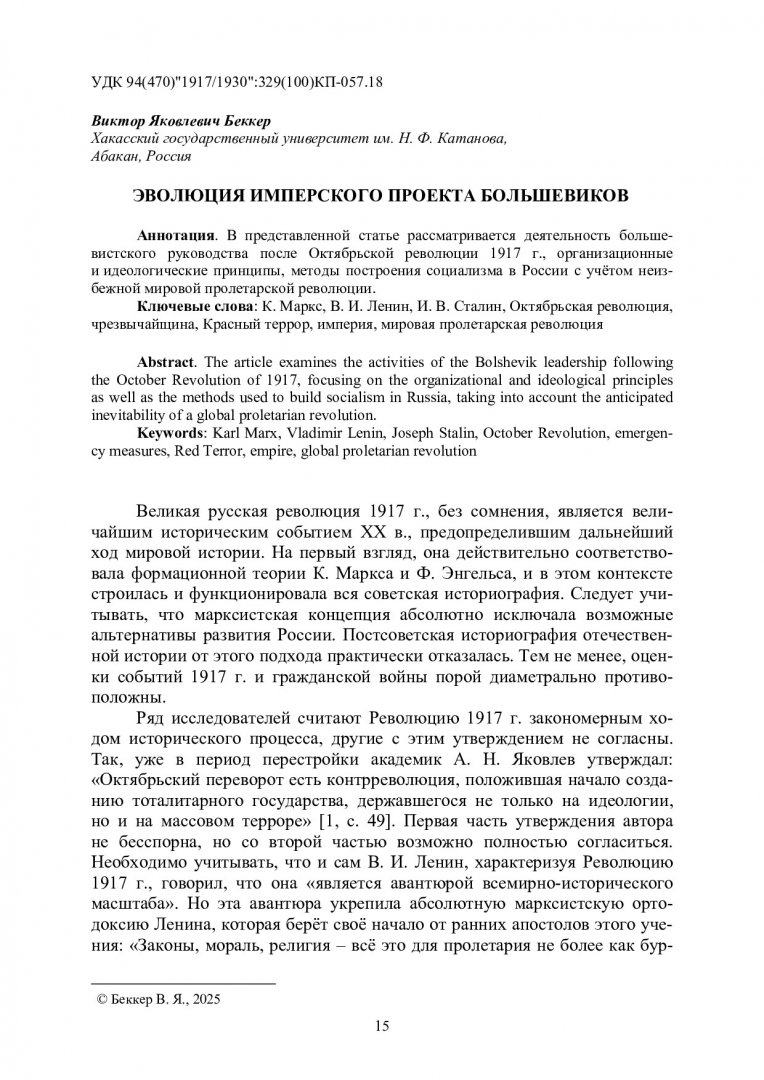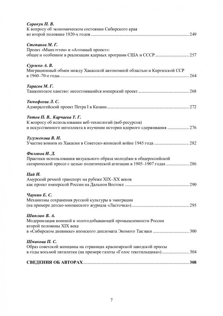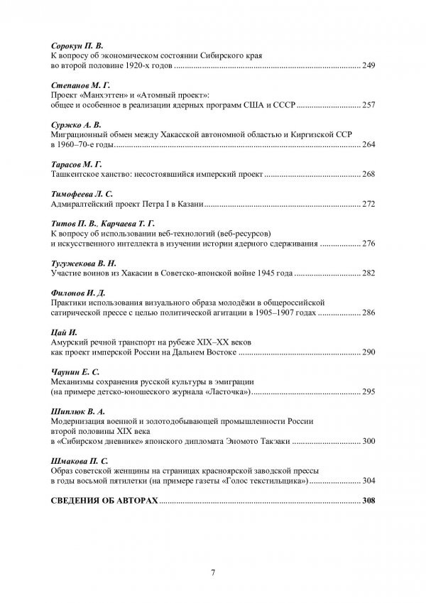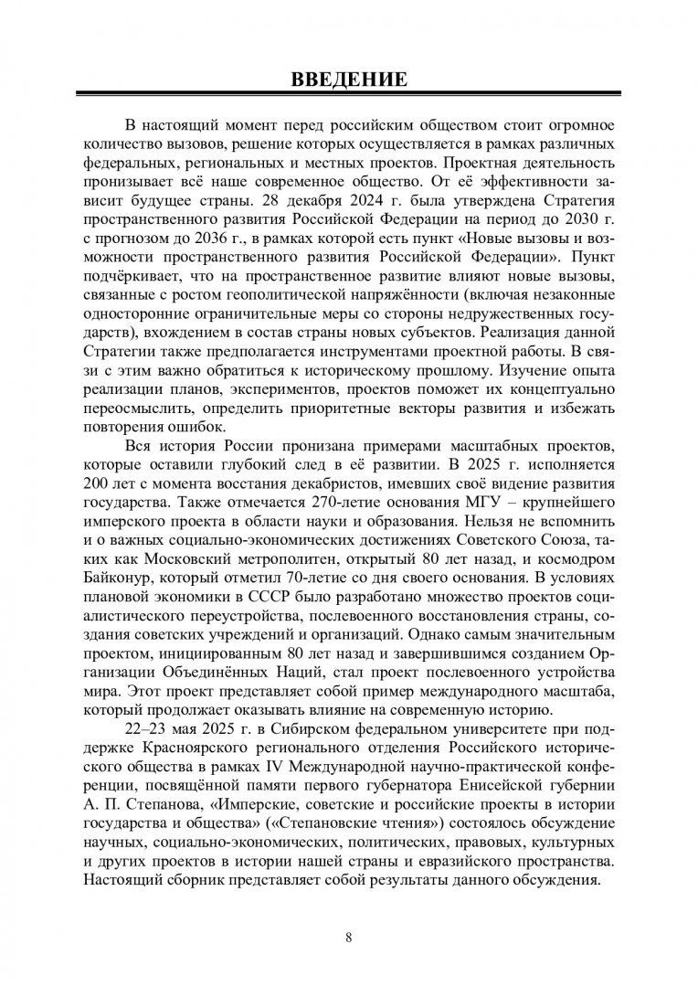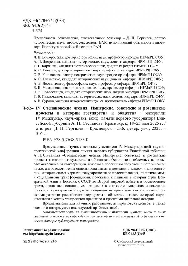 Библиографическое описание: IV Степановские чтения. Имперские, советские и российские проекты в историческом государстве и обществе : материалы IV Международной научно-практической конференции памяти первого губернатора Енисейской губернии А. П. Степанова. Красноярск, 19–23 мая 2025 г. / Сибирский федеральный университет, Гуманитарный институт ; отв. ред. Д. Н. Гергилев ; редкол.: Л. В. Белгородская, А. П. Дворецкая, Т. Г. Карчаева [и др.]. - Электрон. текстовые дан. (pdf, 7.1 Мб). - Красноярск : СФУ, 2025 (2025-12-09). - 316 с., 18.0 усл. печ. л. : табл., ил. - Загл. с титул. экрана. - Электрон. версия печ. публикации . - Загл. обл. : Имперские, советские и российские проекты в историческом государстве и обществе. - Библиогр. в конце ст. - 500 экз. - ISBN 978-5-7638-5183-0 : Б. ц. - Изд. № 2025-25462. - Текст : электронный.