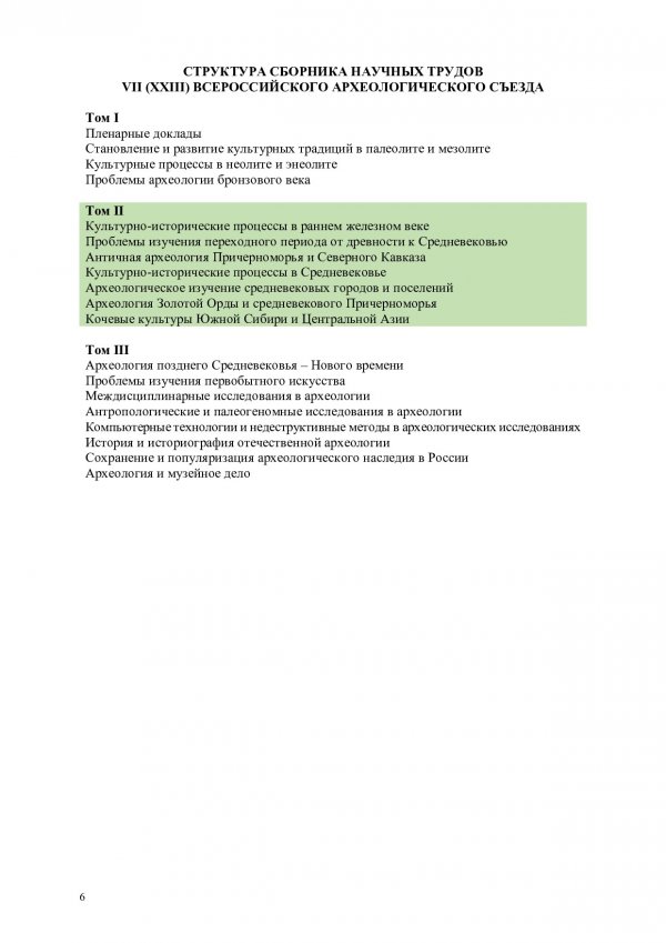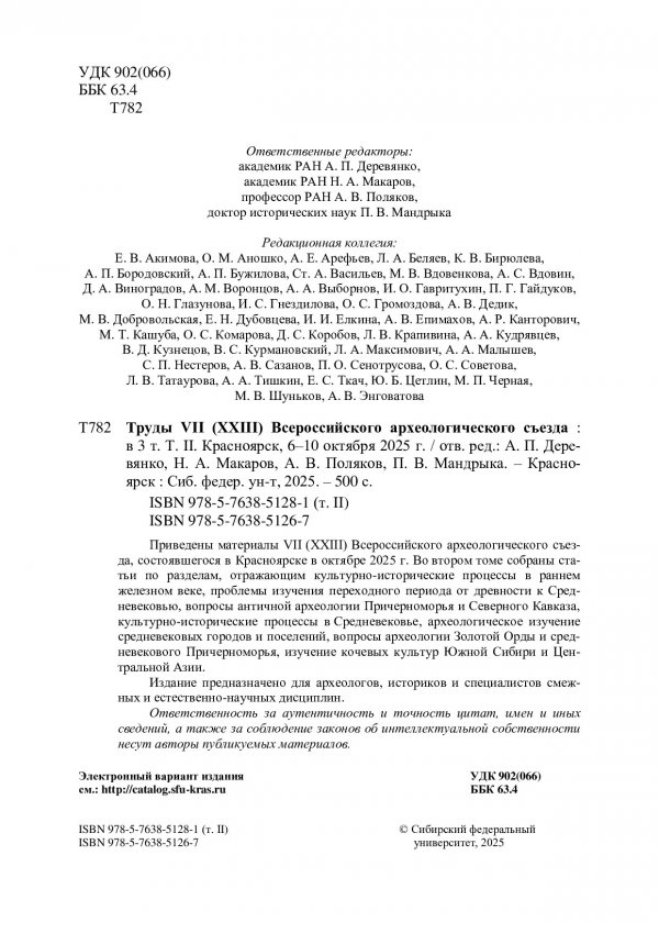 Библиографическое описание: Труды VII (XXIII) Всероссийского археологического съезда : [сборник научных трудов]: в 3 томах, Красноярске, 6-10 октября 2025 г. / Российская академия наук, Институт археологии, Российская академия наук, Институт истории материал. культуры, Российская академия наук, Сибирское отделение, Институт археологии и этнографии, Сибирский федеральный университет, Гуманитарный институт; отв. ред. А. П. Деревянко, Н. А. Макаров, А. В. Поляков, П. В. Мандрыка; редкол. Е. В. Акимова, О. М. Аношко, А. Е. Арефьев [и др.]. - Электрон. текстовые дан. (pdf, 39.4 Мб). - Красноярск : СФУ, 2025 . - Загл. с титул. экрана. - Электрон. версия печ. публикации . - ISBN 978-5-7638-5126-7. - Текст : электронный. Т. II. - 2025 (2025-08-14). - 500 с., 58.0 усл. печ. л. : ил., цв. ил., табл., граф. - Библиогр. в конце ст. - 100 экз. - ISBN 978-5-7638-5128-1 : Б. ц. - Изд. № 2025-24237