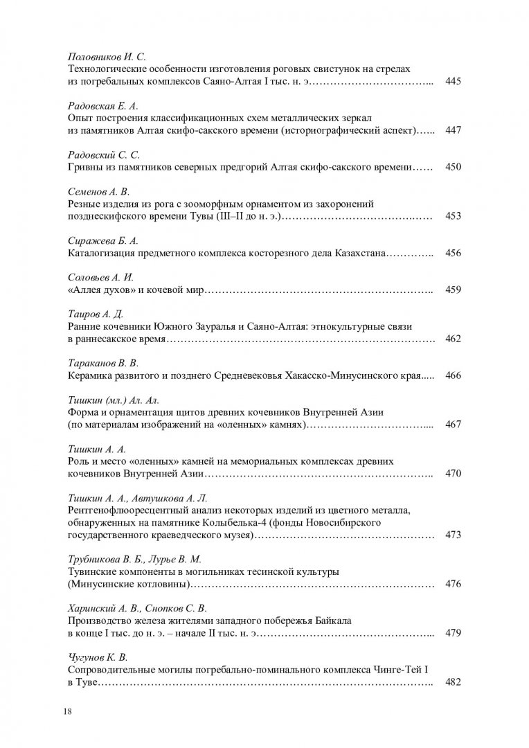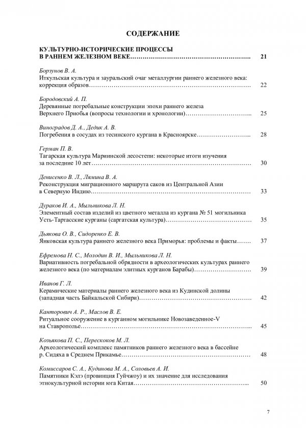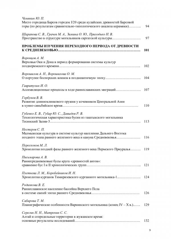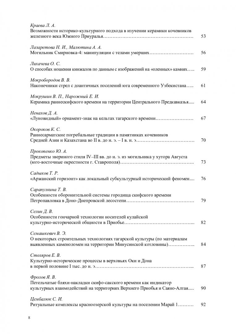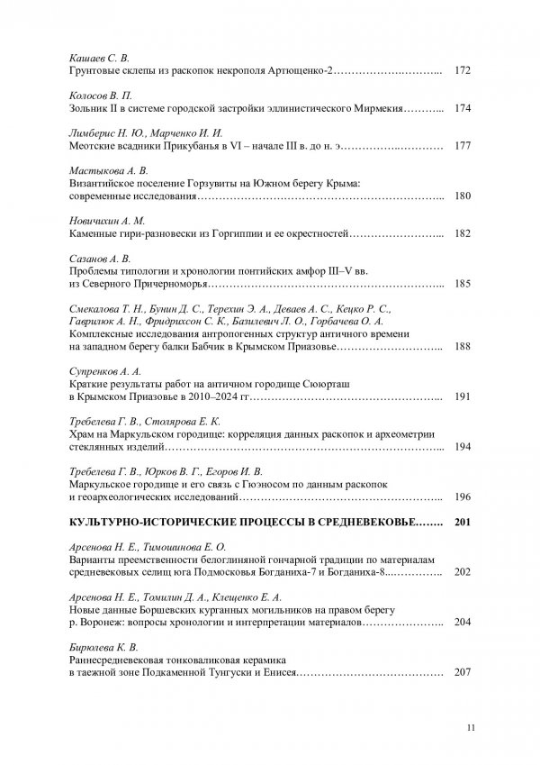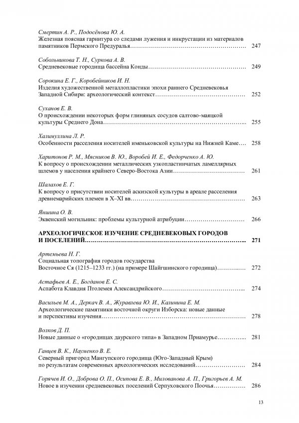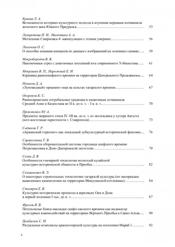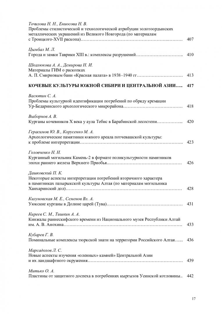 Ключевые слова: железны век, культурно-исторические процессы, античная археология, средневековье, культурно-исторические процессы, археологическое изучение городов и поселений, Золотая Орда, археология, культура Южной Сибири, культура Центральной Азии, иткульская культура, тагарская культура, изделия из цветного металла (саргатская культура), янковская культура, могильник Новозаведенное-V, ритуальное сооружение, памятники Кэлэ (Китай), могильник Смирновка-4, раннесарматские погребальные традиции, городища скифского времени, раннеславянские миграции, длинноклинковое оружие кочевников, таштыкский могильник Тесинский Залив-3, Тимирязевский курганный могильник-1, Варнинский могильник, Оглахтинский могильник, археология Крыма, Семибратнее городище, некрополь Артющенко-2, городище Сююрташ, Маркульское городище, древнерусское государство, могильник Стексово-2, Танкеевский могильник, половецкие изваяния, памятники салтово-маяцкого типа, керамика средневековая, средневековые городища, археологические исследования, аскизская культура, X-XI вв., замки Тевтонского ордена, XIV-XV вв., селище Выбуты, Ярославово дворище, западносибирские городища, археология, оборонительные сооружения средневековые, Аткарский могильник, золотоордынские города, сырцовая архитектура, строительное дело в Золотой Орде, Селитренное гордище, Багаевское селище, мордовская керамика, металлические украшения Золотой Орды, курганы кочевников, X в., курганный могильник Камень-2, пазырыкская культура Алтая, Уюкские курганы (Тува)