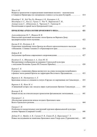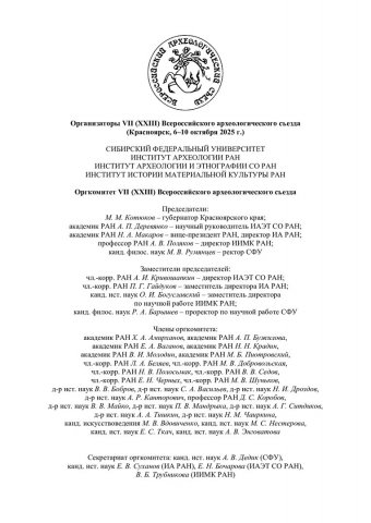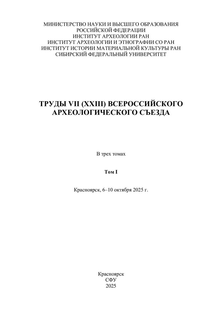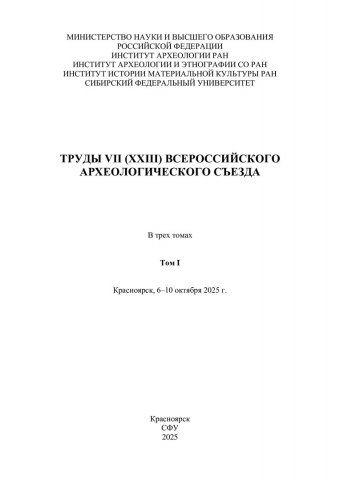 Аннотация: Представлены материалы VII (XXIII) Всероссийского археологического съезда, состоявшегося в Красноярске в октябре 2025 г. В первом томе приведены тексты докладов пленарного заседания и секций, тематика которых включает проблемы становления и развития культурных традиций в каменном и бронзовом веках. Издание предназначено для археологов, историков и специалистов смежных и естественнонаучных дисциплин.
