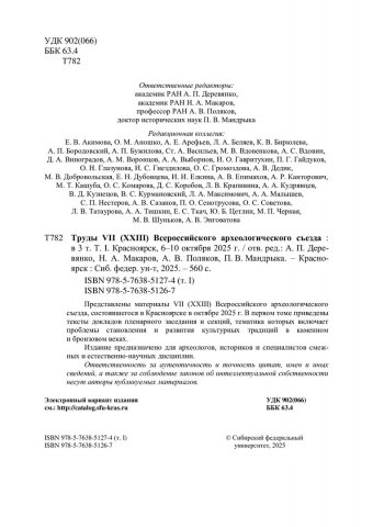 Библиографическое описание: Всероссийский археологический съезд (7 ; 2025 ; Красноярск). Труды VII (XXIII) Всероссийского археологического съезда : [сборник научных трудов] : в 3 томах, Красноярск, 6-10 октября 2025 г. / Российская академия наук, Институт археологии [и др.] ; [отв. ред. А. П. Деревянко [и др.] ; редкол. Е. В. Акимова [и др.]. - Красноярск : СФУ, 2025. - ISBN 978-5-7638-5126-7. - Текст : электронный. + Текст : непосредственный. Т. I. - 2025 (2025-08-14). - 557 с., 65.0 усл. печ. л. : ил., цв. ил. - Библиогр. в конце ст. - 1000 экз. - ISBN 978-5-7638-5127-4 : 616.00 р. - Изд. № 2025-24236 Скопировать