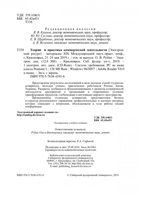 Библиографическое описание: Теория и практика коммерческой деятельности : материалы XIX Международной научно-практической конференции, Красноярск, 21–24 мая 2019 г. / Сиб. федер. ун-т, Ин-т торговли и сферы услуг ; отв. за вып. О. В. Рубан ; редкол. В. В. Куимов [и др.]. - Электрон. текстовые дан. (pdf, 13,5 Мб). - Красноярск : СФУ, 2019. - Загл. с титул. экрана. - ISBN 978-5-7638-4191-6 : Б. ц. - Изд. № 2019-9364. - Текст : электронный.