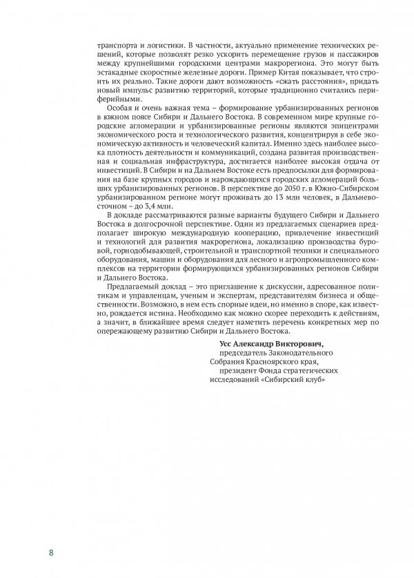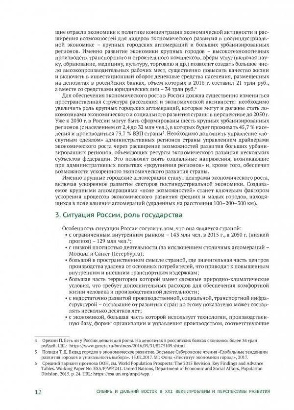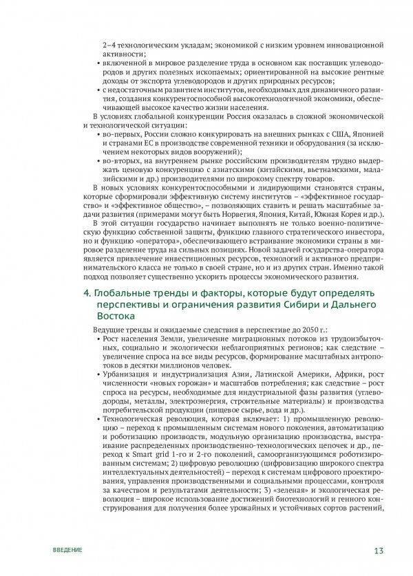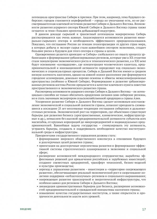 Аннотация: Представлен анализ социально-экономических проблем Сибири и Дальнего Востока. Рассмотрены глобальные тренды как внешние условия развития макрорегиона; место Сибири в экономическом и социальном пространстве России; ее ресурсный потенциал и проблемы его вовлечения в экономическое развитие страны. Будущее Сибири и Дальнего Востока представлено в виде поля сценарных вариантов, показаны условия, содержательные особенности и количественные характеристики сценариев. Обсуждается перспектива формирования урбанизированных регионов – Южно-Сибирского и Дальневосточного, приведены количественные оценки возможной численности населения и ВРП данных урбанизированных регионов в перспективе до 2030 и 2050 гг. Рассмотрены важнейшие слагаемые развития макрорегиона: транзитный потенциал и формирование транспортного каркаса, перспективы нефтегазового комплекса, агропромышленного комплекса, акватерриториальных производственных комплексов Арктики. Предложен ряд «императивов развития» Сибири и Дальнего Востока. Предназначено специалистам в области государственного управления и регионального развития, преподавателям вузов, аспирантам и студентам экономических и социальных направлений подготовки.