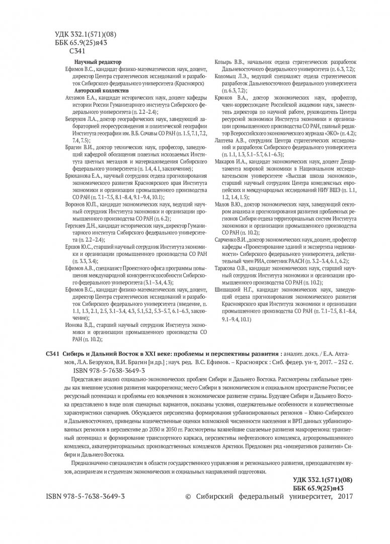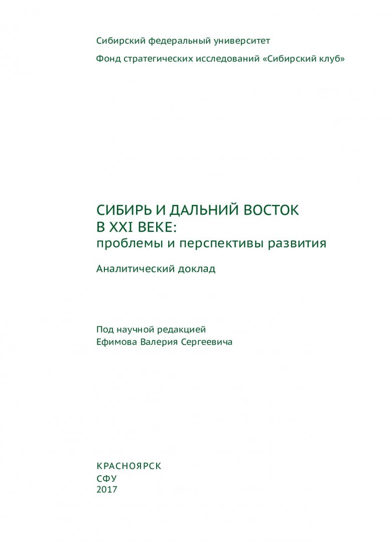 Библиографическое описание: Сибирь и Дальний Восток в XXI веке: проблемы и перспективы развития : аналитический доклад / Сиб. федер. ун-т, Фонд стратег. исслед. "Сиб. клуб" ; науч. ред. В. С. Ефимов. - Красноярск : СФУ, 2017. - 251 с. : табл., цв.ил. - Библиогр.: с. 233-244. - 500 экз. - ISBN 978-5-7638-3649-3 : 1973.00 р. - Изд. № 2017-1018. - Текст : непосредственный + Текст : электронный.
