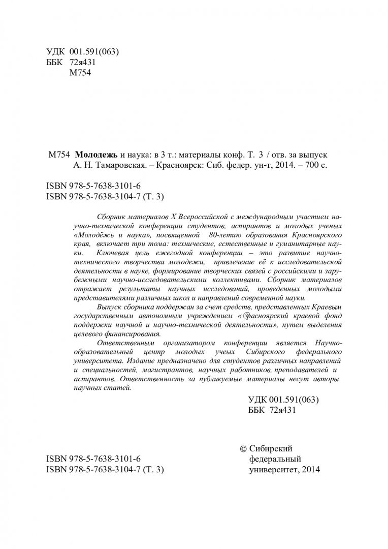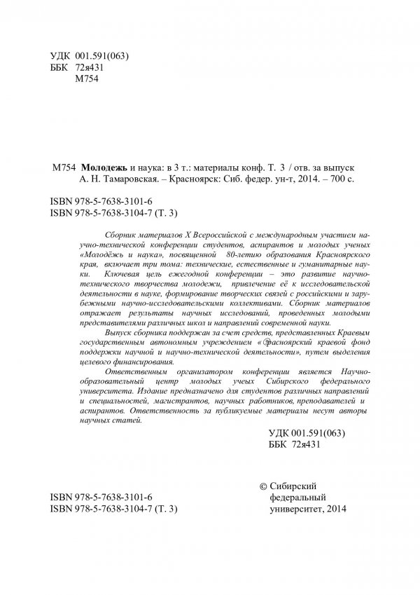 Библиографическое описание:Молодежь и наука : материалы X Всероссийской научно-технической конференции студентов, аспирантов и молодых ученых, [посвященной 80-летию образования Красноярского края]: в 3-х т. / Сиб. федер. ун-т; отв. за вып. А. Н. Тамаровская. - Красноярск : СФУ, 2014 - . - ISBN 978-5-7638-3101-6. - Текст : непосредственный. + Текст : электронный. Т. 3. - 2014. - 699 с. : цв.ил., рис., табл. - Библиогр. в конце ст. - ISBN 978-5-7638-3104-7 : 1430.00 р. - Изд. № 2014-2284