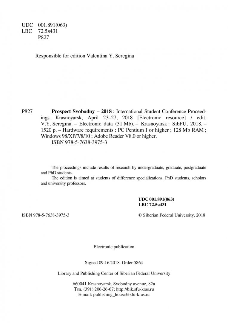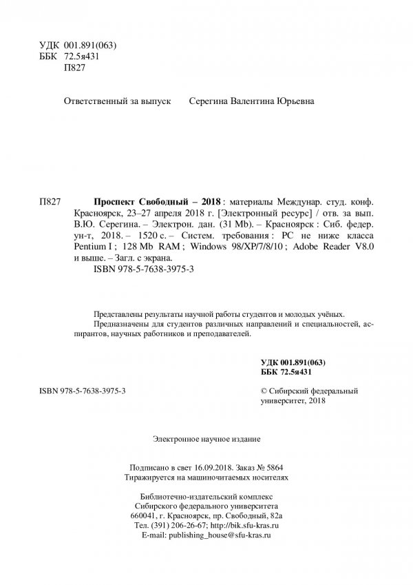Библиографическое описание: Проспект Свободный - 2018 : материалы Международной студенческой конференции, Красноярск, 23–27 апреля 2018 г. / Сиб. федер. ун-т ; отв. за вып. В. Ю. Серегина. - Электрон. текстовые дан. (pdf, 35,9 Мб). - Красноярск : СФУ, 2018. - Загл. с титул. экрана. - ISBN 978-5-7638-3975-3 : Б. ц. - Изд. № 2018-5864. - Текст : непосредственный.