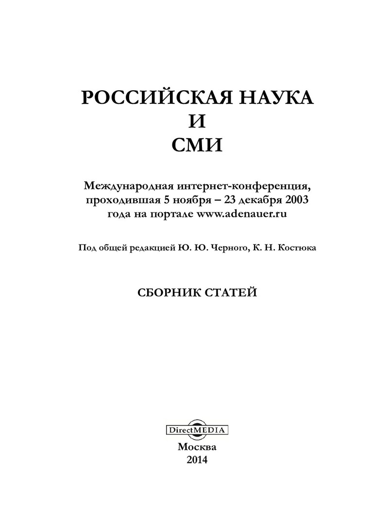Библиографическое описание:Российская наука и СМИ : международная интернет-конференция, проходившая 5 ноября – 23 декабря 2003 года на портале www.adenauer.ru : сборник статей / ред.: Ю. Ю. Черный, К. Н. Костюк. - Электрон. текстовые дан. (6,15 Мб). - Москва : Директ-Медиа, 2014. - Загл. с титул. экрана. - ISBN 978-5-4458-9232-8 : Б. ц. - Текст : электронный.