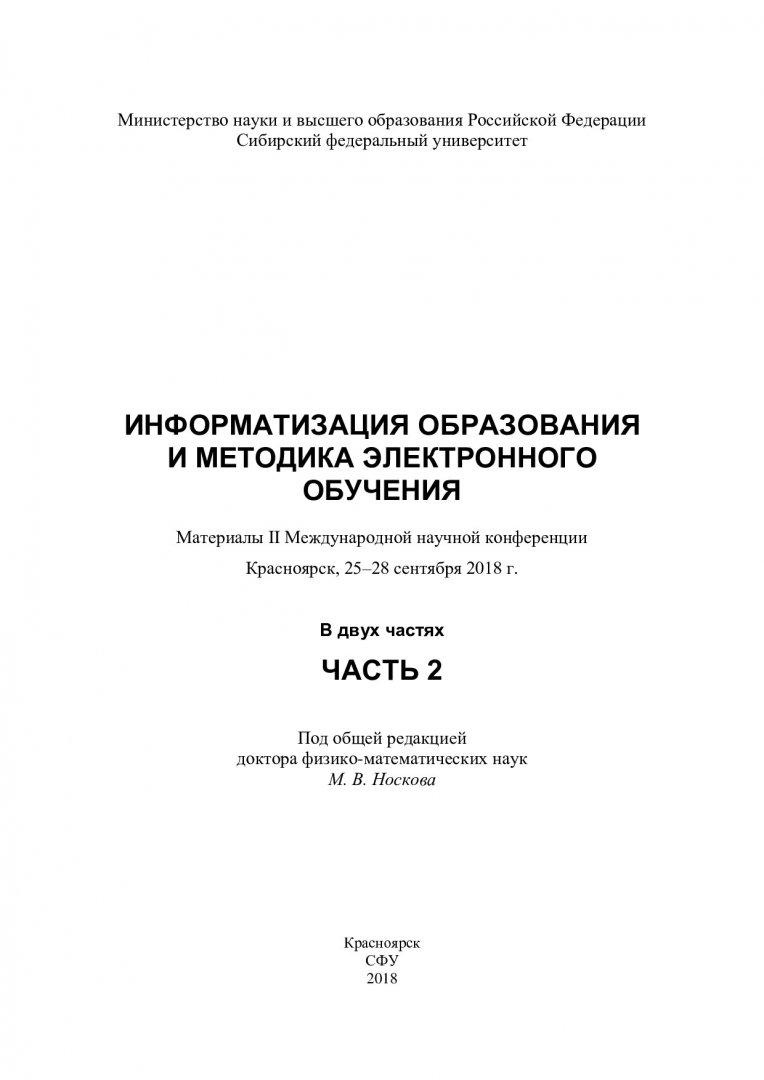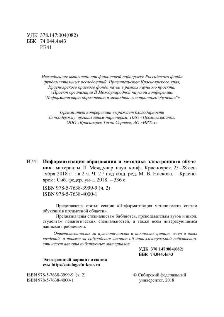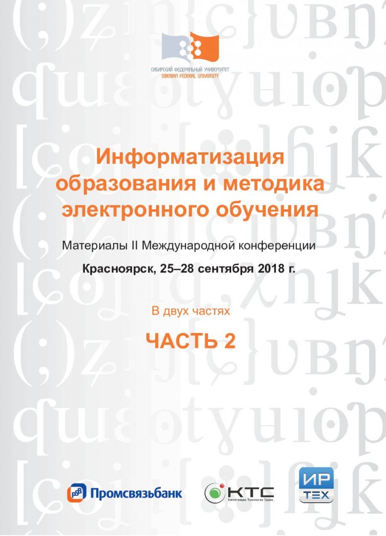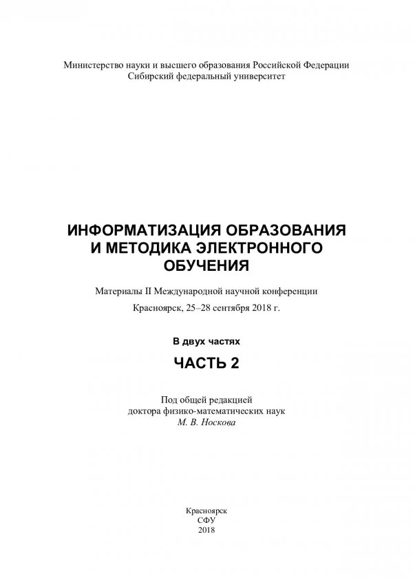 Библиографическое описание:Информатизация образования и методика электронного обучения : материалы II международной конференции Красноярск, 25-28 сентября 2018 г.: сборник: в 2-х ч. / Сиб. федер. ун-т, Ин-т космич. и информ. технологий; отв. ред. М. В. Носков. - Красноярск : СФУ, 2018. - Текст : непосредственный. + Текст : электронный. Ч. 2. - 2018. - 334 с. - Библиогр. в конце ст. - 100 экз. - ISBN 978-5-7638-3999-9 : 446.00 р. - Изд. № 2018-6311