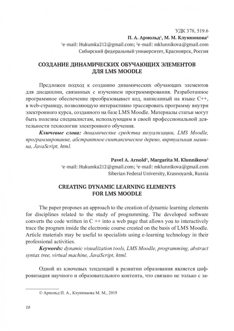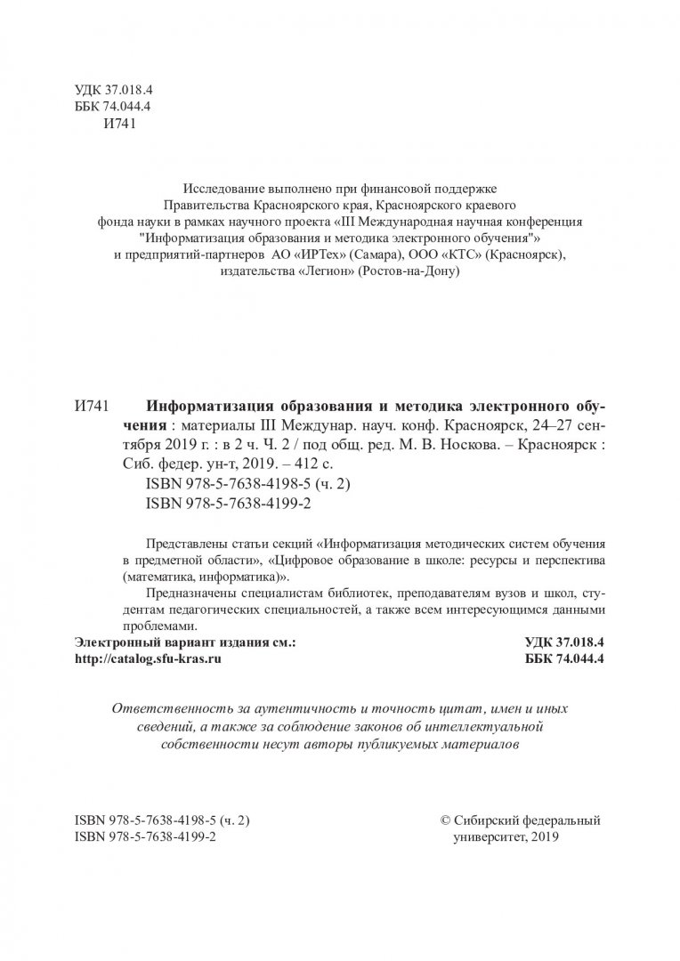 Библиографическое описание:Информатизация образования и методика электронного обучения : материалы III международной научной конференции Красноярск, 24-27 сентября 2019 г.: сборник: в 2-х ч. / Сиб. федер. ун-т ; отв. ред. М. В. Носков. - Красноярск : СФУ, 2019. - ISBN 978-5-7638-4199-2. - Текст : непосредственный. + Текст : электронный. Ч. 2. - 2019. - 410 с. - Библиогр. в конце ст. - 100 экз. - ISBN 978-5-7638-4198-5 : 380.00 р. - Изд. № 2019-9414
