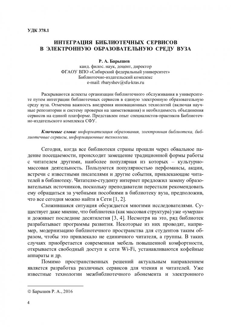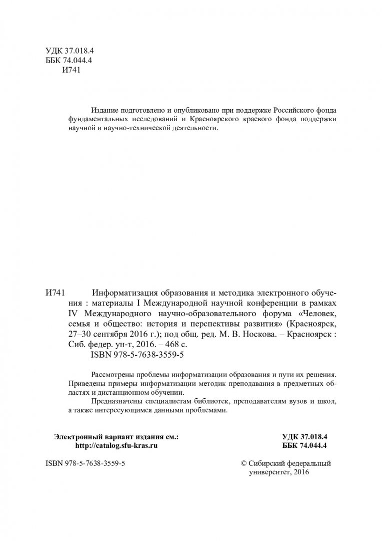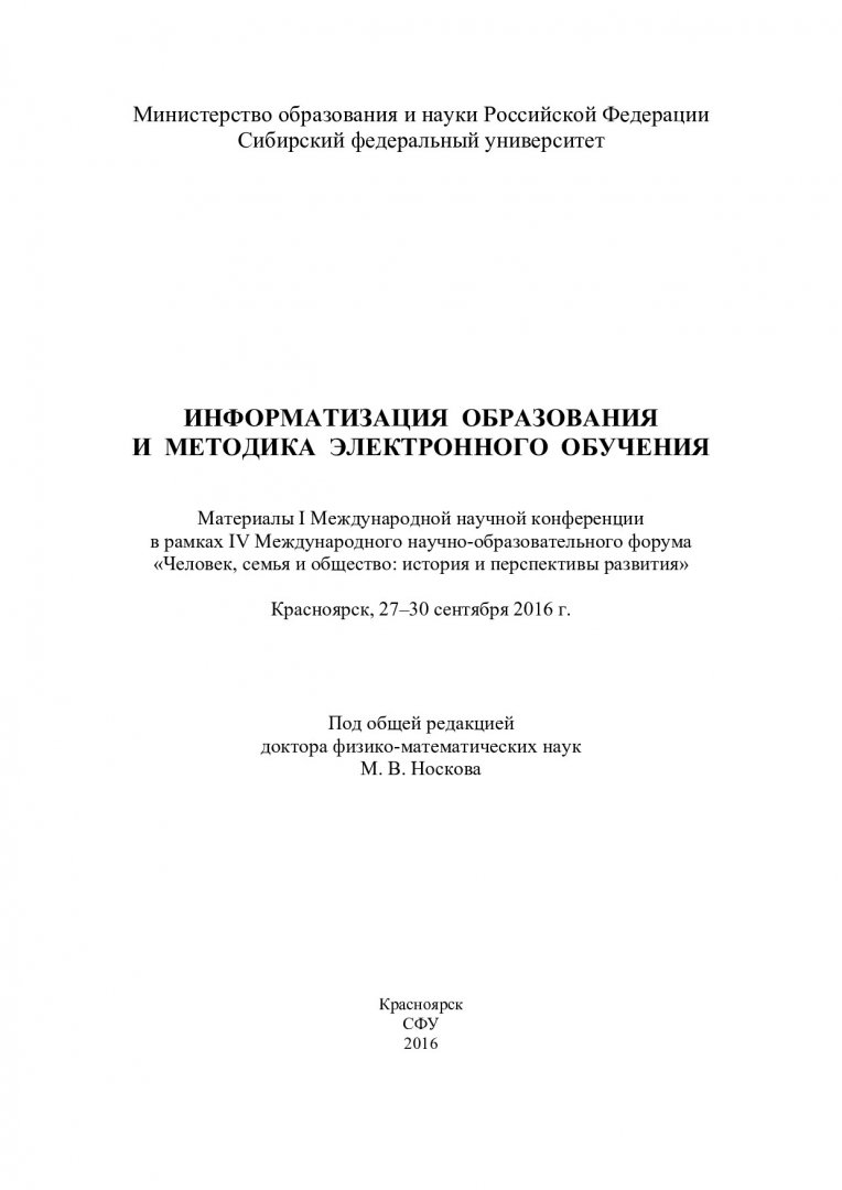 Библиографическое описание:Информатизация образования и методика электронного обучения : материалы I Международной научной конференции в рамках IV Международного научно-образовательного форума "Человек, семья и общество: история и перспективы развития", 27-30 сентября 2016 г., Красноярск / Сиб. федер. ун-т, Ин-т космич. и информ. технологий ; отв. ред. М. В. Носков. - Красноярск : СФУ, 2016. - 465 с. - Библиогр. в конце ст. - 100 экз. - ISBN 978-5-7638-3559-5 : 501.00 р., 300.00 р. - Изд. № 2016-3056. - Текст : непосредственный + Текст : электронный.