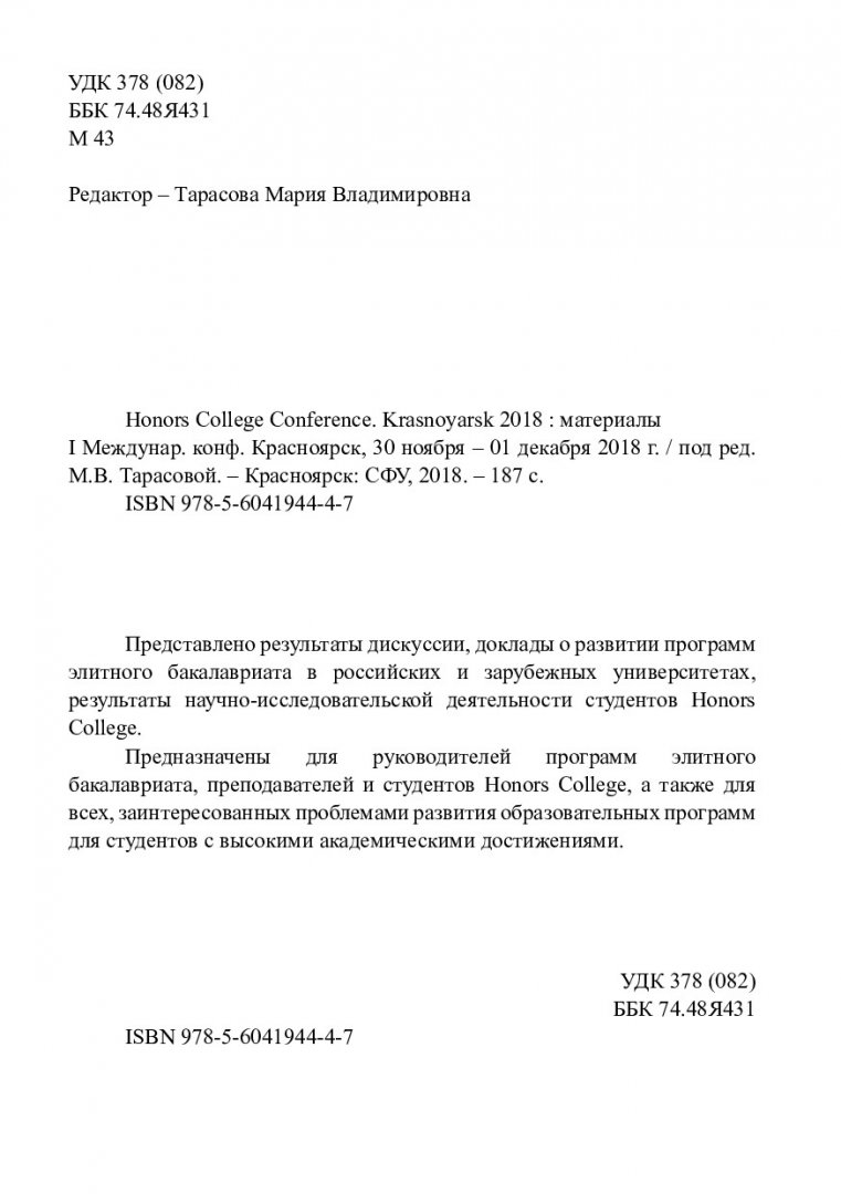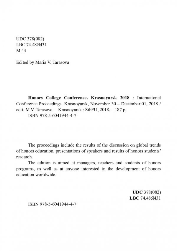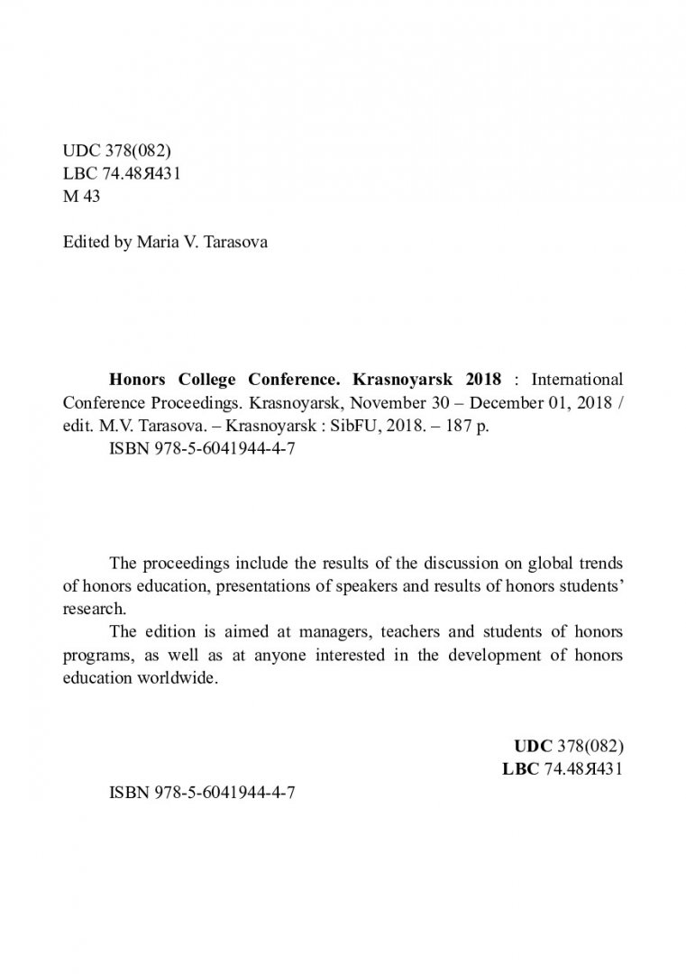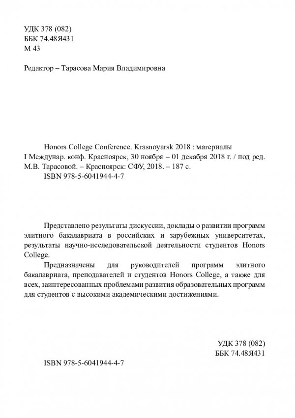 Библиографическое описание: Honors college conference. Krasnoyarsk 2018 : материалы Международной конференции, Красноярск, 30 ноября - 01 декабря 2018 г. / Сиб. федер. ун-т ; ред. М. В. Тарасова. - Электрон. текстовые дан. (pdf, 11,4 Мб). - Красноярск : СФУ, 2018. - Загл. с титул. экрана. - ISBN 978560419447 : Б. ц. - Текст : электронный.