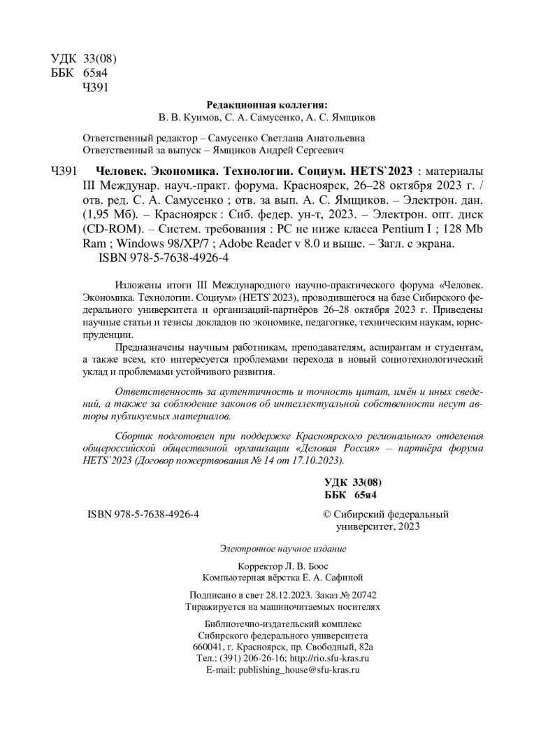 Библиографическое описание: Человек. Экономика. Технологии. Социум. HETS`2023 : материалы III Международного научно-практического форума. Красноярск, 26–28 октября 2023 г. / Сиб. федер. ун-т, Ин-т упр. бизнес-процессами ; отв. ред. С. А. Самусенко ; отв. за вып. А. С. Ямщиков. - Электрон. текстовые дан. (pdf, 2 Мб). - Красноярск : СФУ, 2023 (2023-12-28). - 108 с. - Загл. с титул. экрана. - ISBN 978-5-7638-4926-4 : Б. ц. - Изд. № 2023-20742. - Текст : электронный.