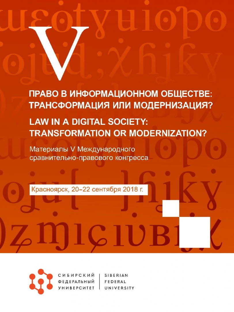 Библиографическое описание:Право в информационном обществе: трансформация или модернизация? = Law in a digital society: transformation or modernization? : материалы V Международного сравнительно-правового конгресса, Красноярск, 20-22 сентября 2018 г. / Сиб. федер. ун-т, Юрид. ин-т ; отв. ред. А. Ф. Васильева. - Красноярск : СФУ, 2019. - 202 с. - Библиогр. в конце ст. - 500 экз. - ISBN 978-5-7638-4186-2 : 424.00 р. - Изд. № 2019-9212. - Текст : непосредственный + Текст : электронный.