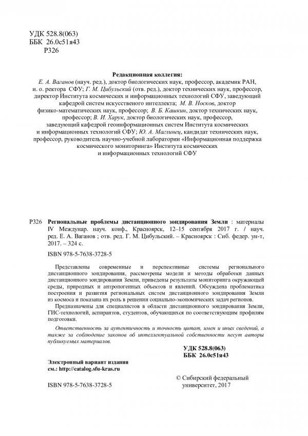 Библиографическое описание: Региональные проблемы дистанционного зондирования Земли : материалы IV Международной научной конференции, Красноярск, 12-15 сентября 2017 г. / Сиб. федер. ун-т, Ин-т космич. и информ. технологий ; науч. ред. Е. А. Ваганов, отв. ред. Г. М. Цибульский. - Красноярск : СФУ, 2017. - 323 с. : ил., граф., рис., табл. - Библиогр. в конце ст. - 100 экз. - ISBN 978-5-7638-3728-5 : 360.00 р. - Изд. № 2017-2191. - Текст : непосредственный + Текст : электронный.