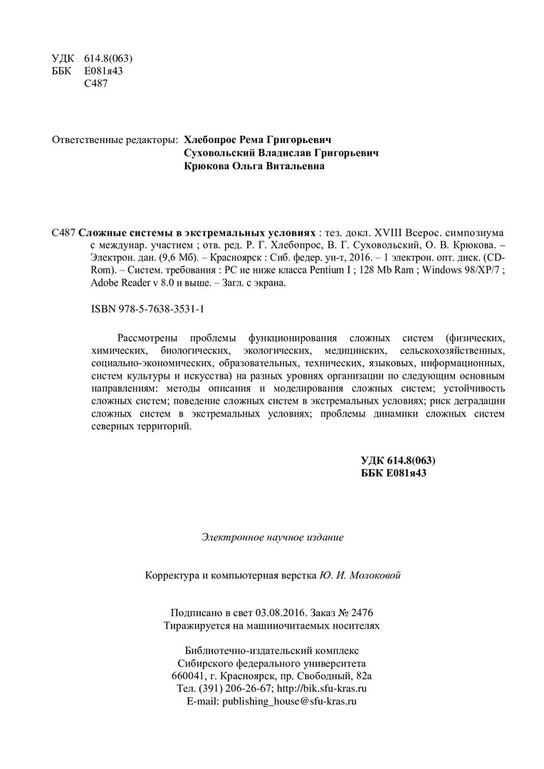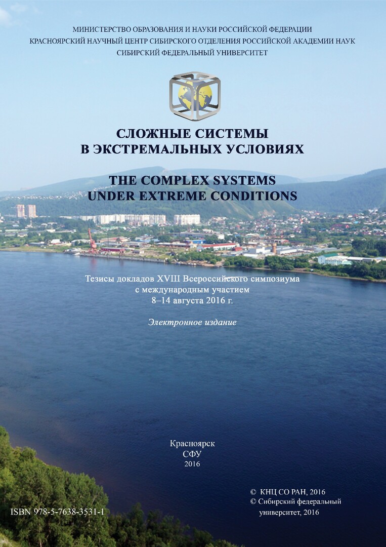 Библиографическое описание: Сложные системы в экстремальных условиях : тезисы докладов XVIII Всероссийского симпозиума с международным участием / Сиб. федер. ун-т, Ин-т экономики, упр. и природопользования ; отв. ред.: Р. Г. Хлебопрос, В. Г. Суховольский. - Электрон. текстовые дан. (pdf, 9,7 Мб). - Красноярск : СФУ, 2016. - Загл. с титул. экрана. - ISBN 978-5-7638-3531-1 : Б. ц. - Изд. № 2016-2476. - Текст : электронный.