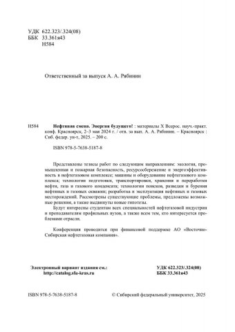 Библиографическое описание: Нефтяная смена. Энергия будущего! : материалы Х Всероссийской научно-практической конференции. Красноярск, 2–3 мая 2024 г. / Сибирский федеральный университет, Институт нефти и газа ; отв. ред. А. А. Рябинин. - Электрон. текстовые дан. (pdf, 17.1 Мб). - Красноярск : СФУ, 2025 (2025-12-05). - 200 с., 25.0 усл. печ. л. : табл., цв.ил. - Загл. с титул. экрана. - Электрон. версия печ. публикации . - Библиогр. в конце ст. - 100 экз. - ISBN 978-5-7638-5187-8 : Б. ц. - Изд. № 2025-25554. - Текст : электронный.