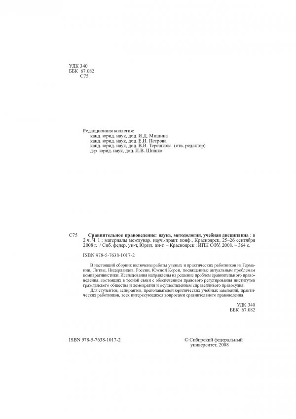 Библиографическое описание:Сравнительное правоведение: наука, методология, учебная дисциплина = Comparative Law: Science, Methodology and Academic Discipline : материалы международной научно-практической конференции. Красноярск, 25-26 сентября 2008 г. : в 2 частях / Сибирский федеральный университет [СФУ]. Юридический институт [ЮИ]; отв. ред. В. В. Терешкова. - Красноярск : ИПК СФУ, 2008 - . - Текст : непосредственный. + Текст : электронный. Часть 1. - 2008. - 363 с. - ISBN 978-5-7638-1017-2 Режим доступа: читальные залы НБ СФУ