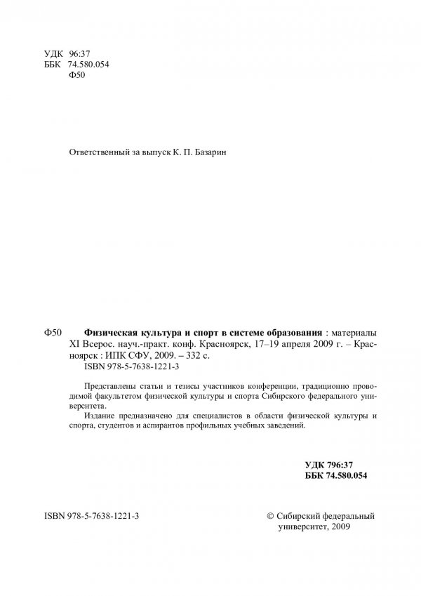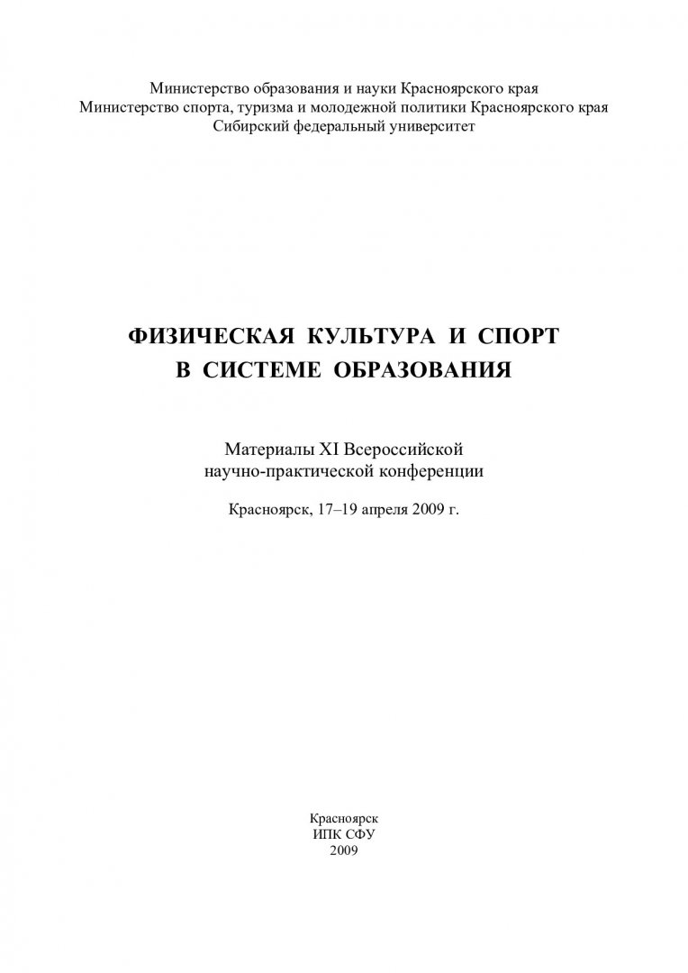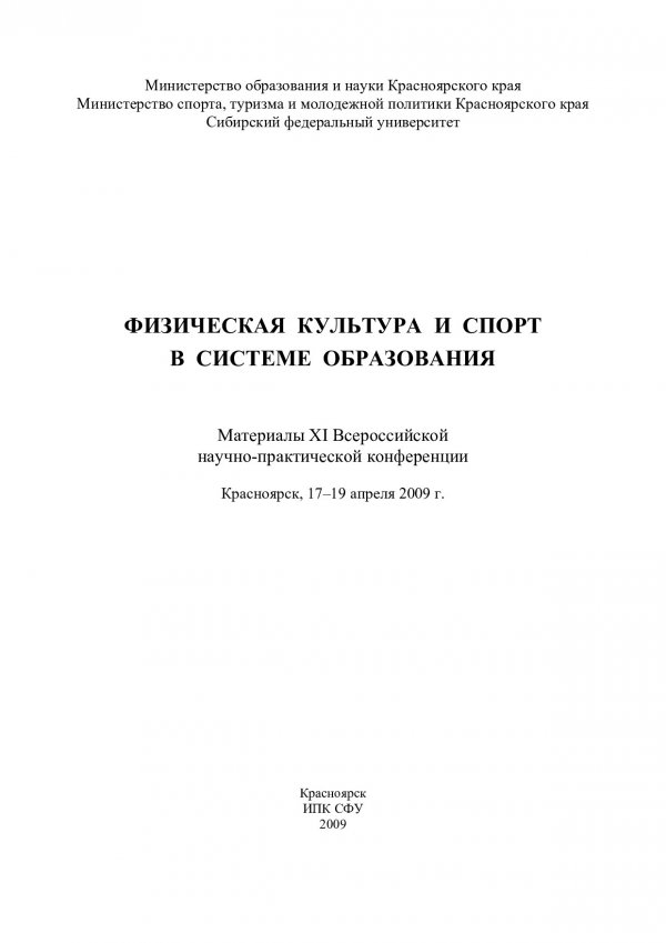 Библиографическое описание:Физическая культура и спорт в системе образования : материалы XI Всероссийской научно-практической конференции. Красноярск, 17-19 апреля 2009 г. / Министерство спорта, туризма и молодежной политики Красноярского края, Сибирский федеральный университет [СФУ] ; отв. за вып. К. П. Базарин. - Красноярск : Информационно-полиграфический комплекс [ИПК] СФУ, 2009. - ISBN 978-5-7638-1221-3. - Текст : электронный.