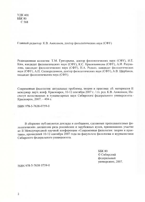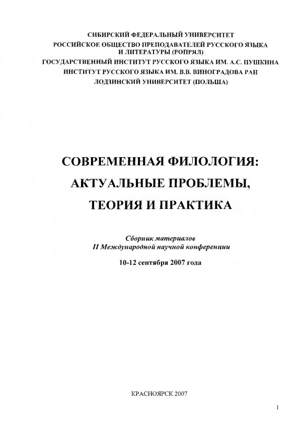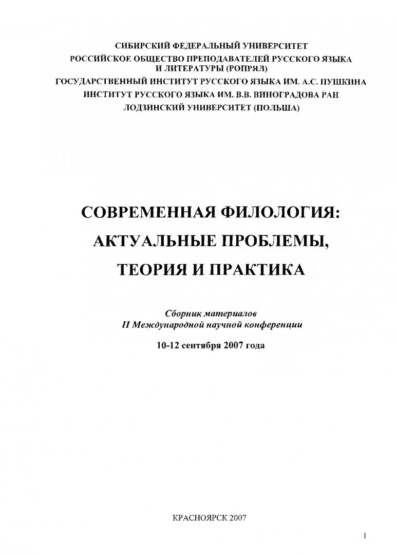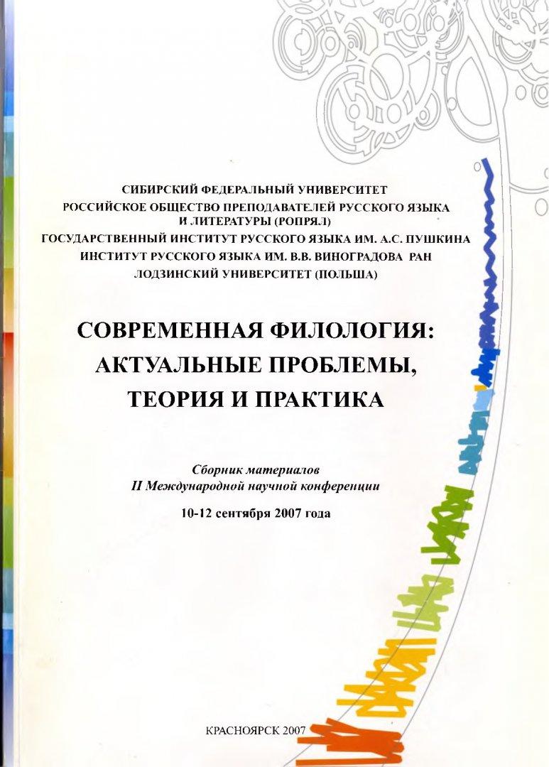 Библиографическое описание:Современная филология: актуальные проблемы, теория и практика : сборник материалов II Международной научной конференции, 10-12 сентября 2007 года / Сибирский федеральный университет [и др.] ; гл. ред. К. В. Анисимов. - Красноярск : Сибирский федеральный университет [СФУ], 2007. - 403 с. - Списки лит. в конце ст. - 105 р. - Текст : непосредственный.