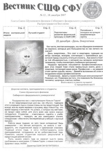 Вестник СШФ СФУ : газета Саяно-Шушенского филиала СФУ. 2007 г. № 12 (18 декабря)выпуск журнала/газеты