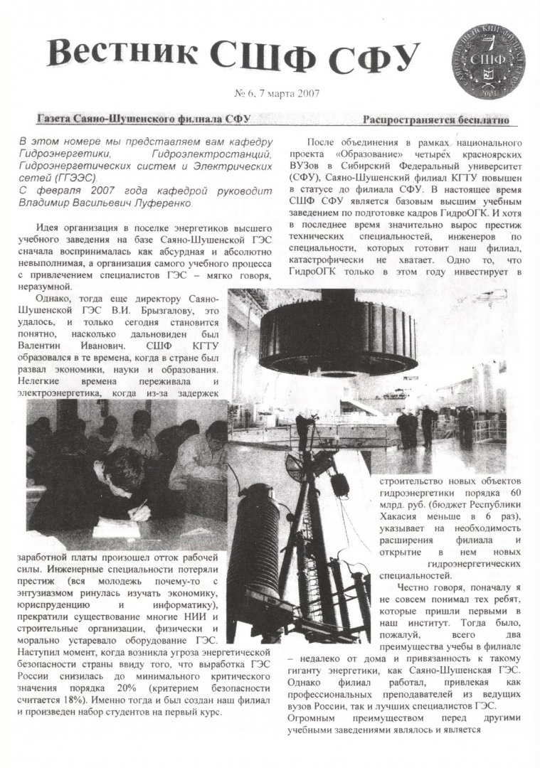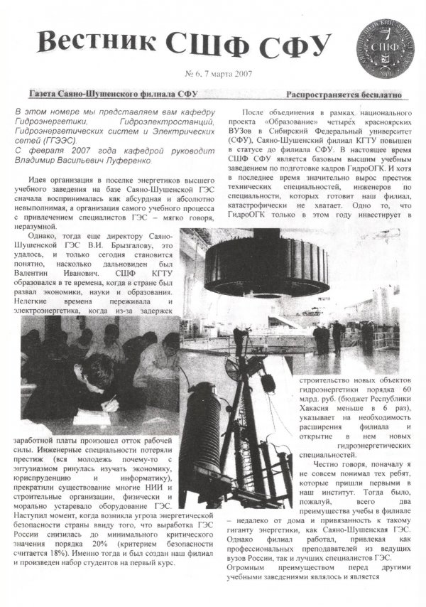 Вестник СШФ СФУ : газета Саяно-Шушенского филиала СФУ. 2007 г. № 6 (7 марта)выпуск журнала/газеты