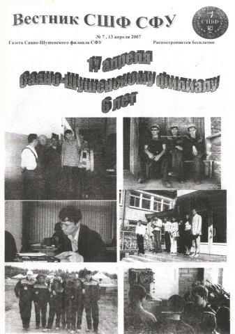 Вестник СШФ СФУ : газета Саяно-Шушенского филиала СФУ. 2007 г. № 7 (13 апреля)выпуск журнала/газеты