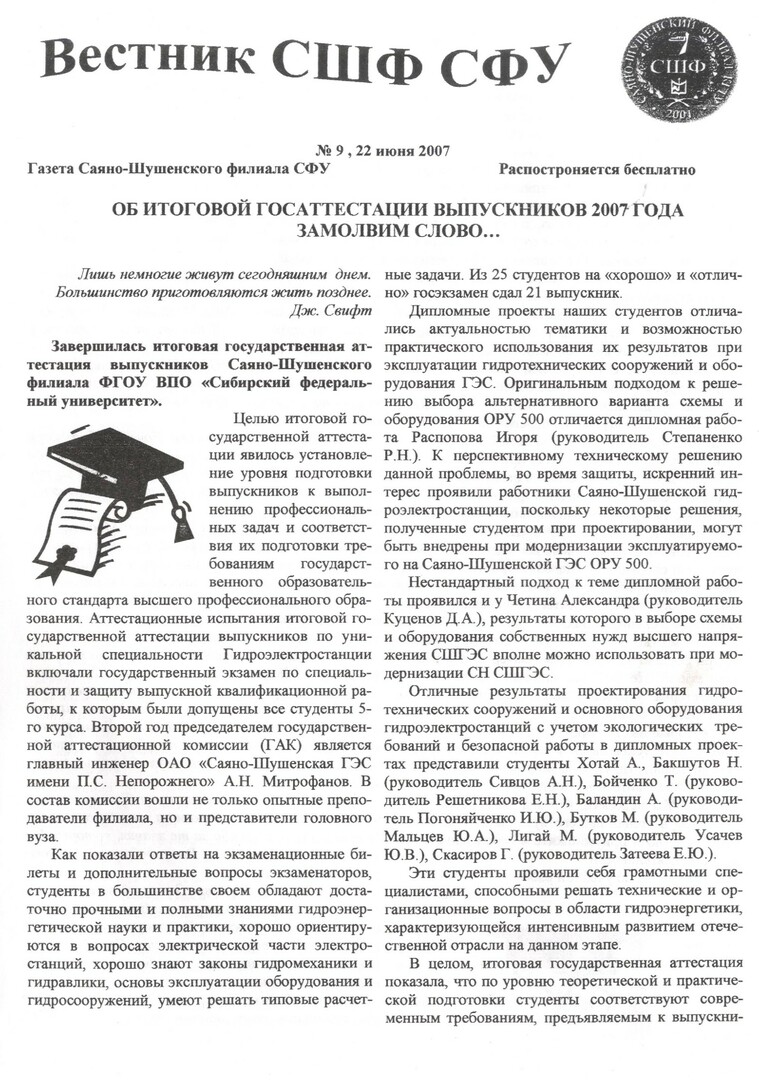 Вестник СШФ СФУ : газета Саяно-Шушенского филиала СФУ. 2007 г. № 9 (22 июня)выпуск журнала/газеты