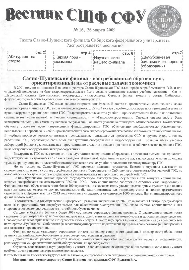 Вестник СШФ СФУ : газета Саяно-Шушенского филиала СФУ. 2009 г. № 16 (26 марта)выпуск журнала/газеты