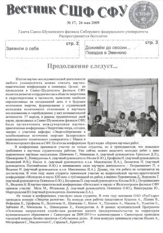 Вестник СШФ СФУ : газета Саяно-Шушенского филиала СФУ. 2009 г. № 17 (26 мая)выпуск журнала/газеты