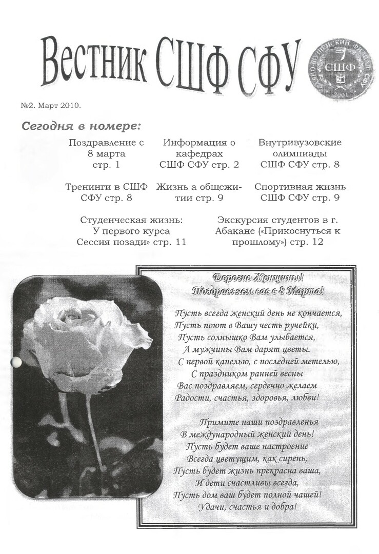Вестник СШФ СФУ : газета Саяно-Шушенского филиала СФУ. 2010 г. № 2 (март)выпуск журнала/газеты