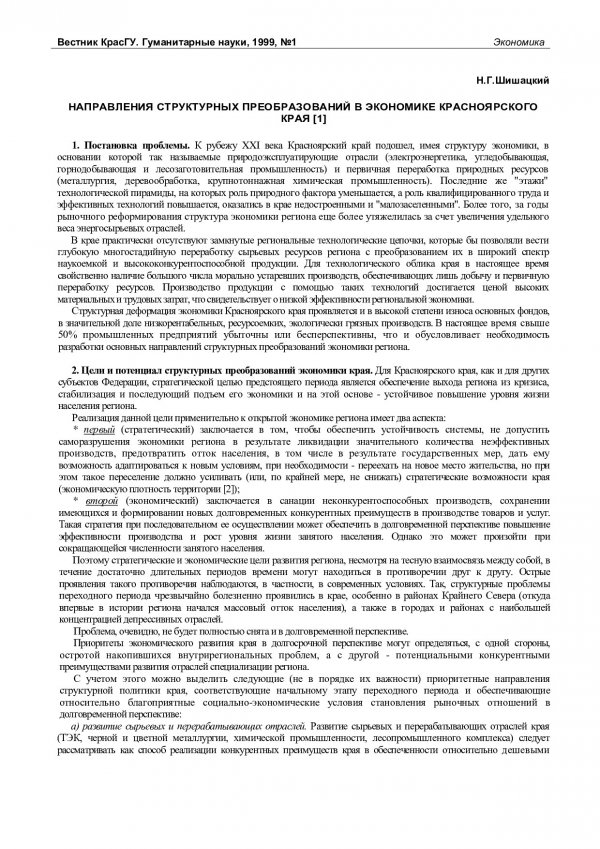Библиографическое описание:Шишацкий, Николай Георгиевич. Направления структурных преобразований в экономике Красноярского края / Н. Г. Шишацкий. - Текст : непосредственный // Вестник Красноярского государственного университета. - 1999. - Гуманитарные науки, № 1. - С. 46-49.