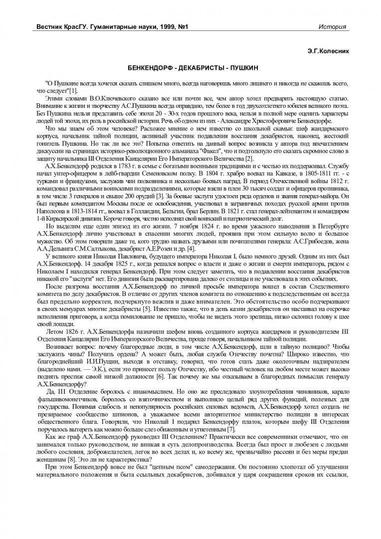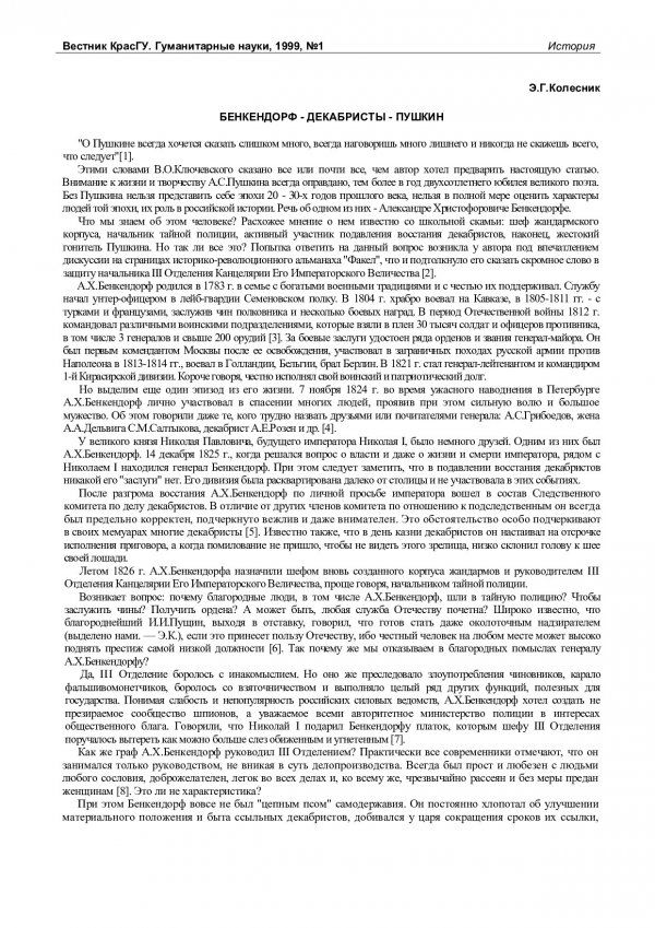 Библиографическое описание:Колесник, Эдуард Григорьевич. Бенкендорф - декабристы - Пушкин / Э. Г. Колесник. - Текст : непосредственный // Вестник Красноярского государственного университета. - 1999. - Гуманитарные науки, № 1. - С. 96-98. - Библиогр. в конце ст.