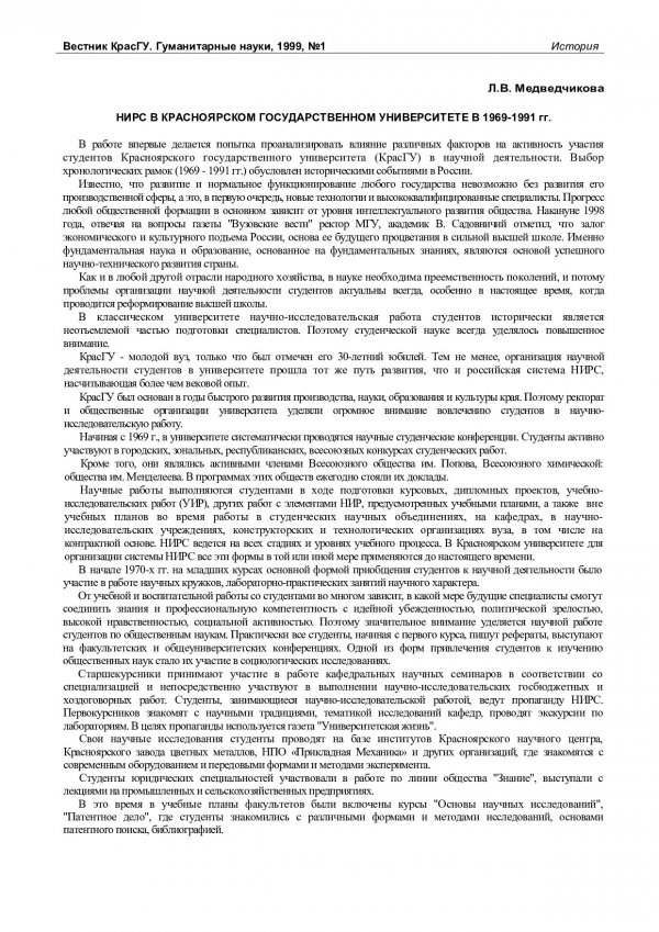 Библиографическое описание:Медведчикова, Л. В. НИРС в Красноярском государственном университете в 1969-1991 гг. / Л. В. Медведчикова. - Текст : непосредственный // Вестник Красноярского государственного университета. - 1999. - Гуманитарные науки, № 1. - С. 101-104. - Библиогр. в конце ст.