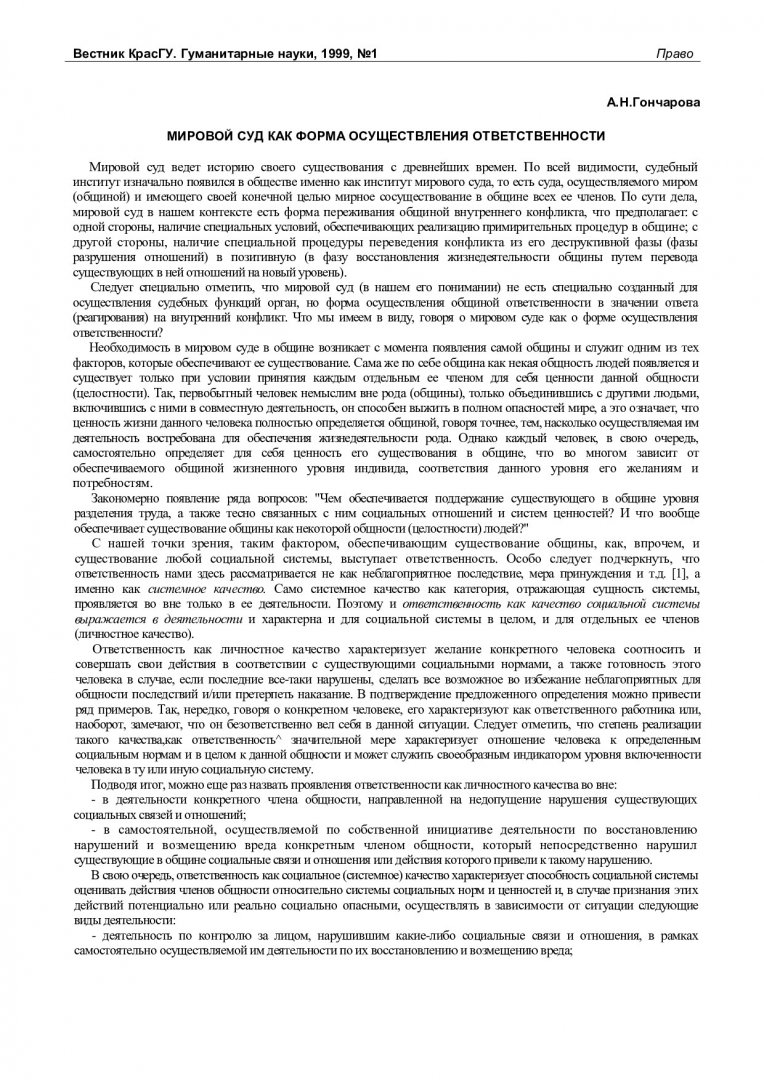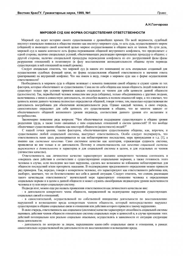 Библиографическое описание:Гончарова, Анна Николаевна. Мировой суд как форма осуществления ответственности / А. Н. Гончарова. - Текст : непосредственный // Вестник Красноярского государственного университета. - 1999. - Гуманитарные науки, № 1. - С. 65-68. - Библиогр. в конце ст.