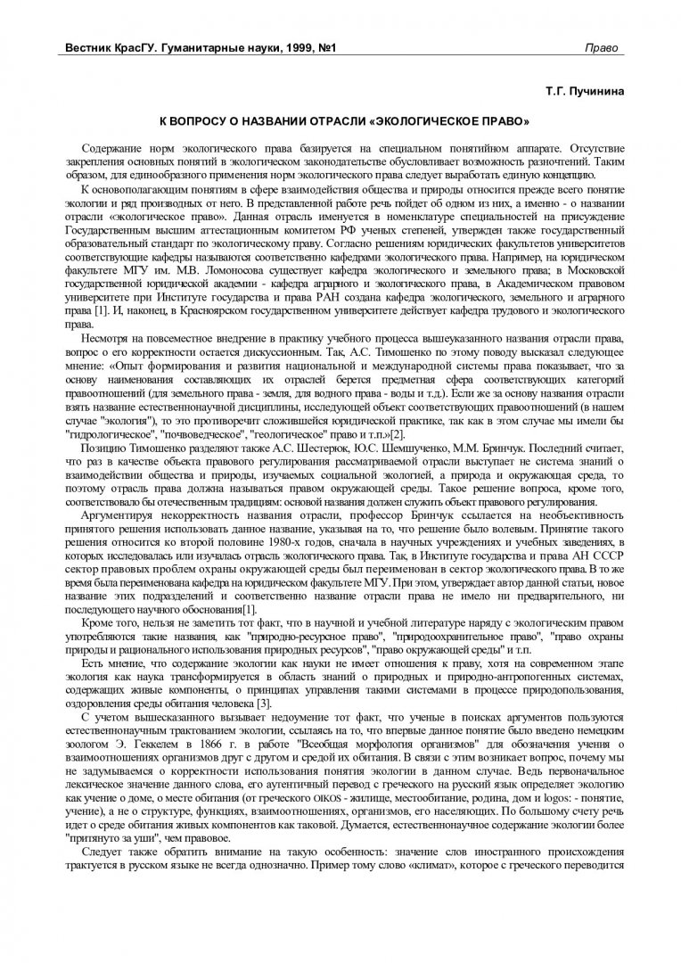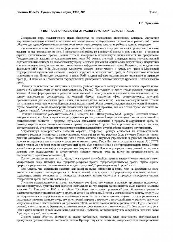 Библиографическое описание:Пучинина, Т. Г. К вопросу о названии отрасли "Экологическое право" / Т. Г. Пучинина. - Текст : непосредственный // Вестник Красноярского государственного университета. - 1999. - Гуманитарные науки, № 1. - С. 70-72. - Библиогр. в конце ст.