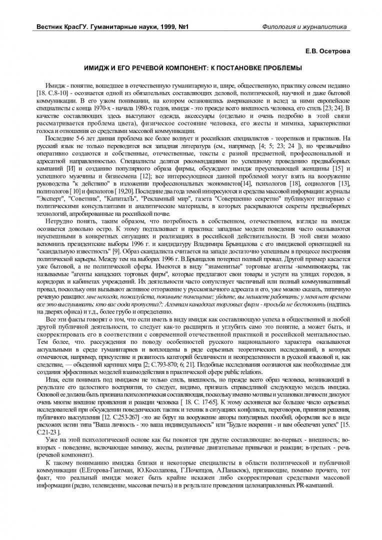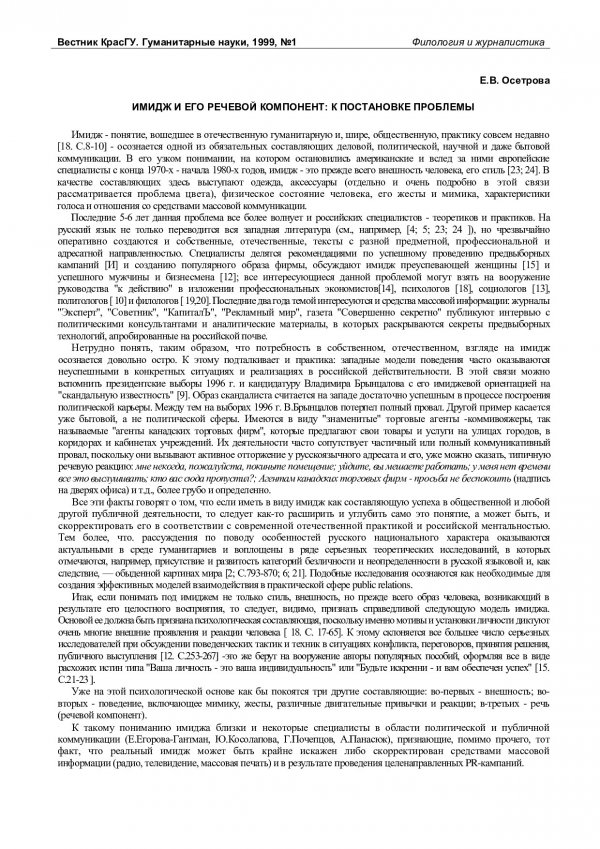 Библиографическое описание:Осетрова, Елена Валерьевна. Имидж и его речевой компонент: к постановке проблемы / Е. В. Осетрова. - Текст : непосредственный // Вестник Красноярского государственного университета. - 1999. - Гуманитарные науки, № 1. - С. 80-83. - Библиогр. в конце ст.